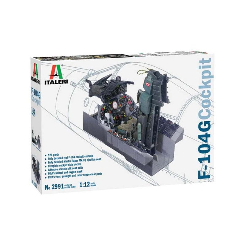1/12 F-104 G Cockpit Italeri 2991124 parts – Fully detailed real F-104 cockpit controls – Fully detailed Martin Baker Mk.I Q ejection seat – Complete cockpit dials decals – Adhesive acetate silk seat belts – Pilots helmet and oxygen mask – Pilots visor, gunsight and radar scope clear partsThe Lockheed F-104 Starfighter is one of the most renowned fighters in aviation history and also the one with the longest operational service. Its history began at the end of the 50s and ended with some air forces in the mid-2000s. Its unique airframe, with slender fuselage and very little wing surface, made this aircraft ideal in an interceptor role. Due to the thrust of its General Electric J79-GE-11A afterburning turbojet engine it could exceed Mach 2,2 with a first class rate of climb. This scale model kit allows modelers to recreate the famous Starfighter cockpit with the typical internal layout of the 50s and 60s fighters, which was home to many former NATO pilots. The fine detail of the instrument panel typical of the period, is matched by the highly accurate reproduction of the Martin-Baker ejection seat.
