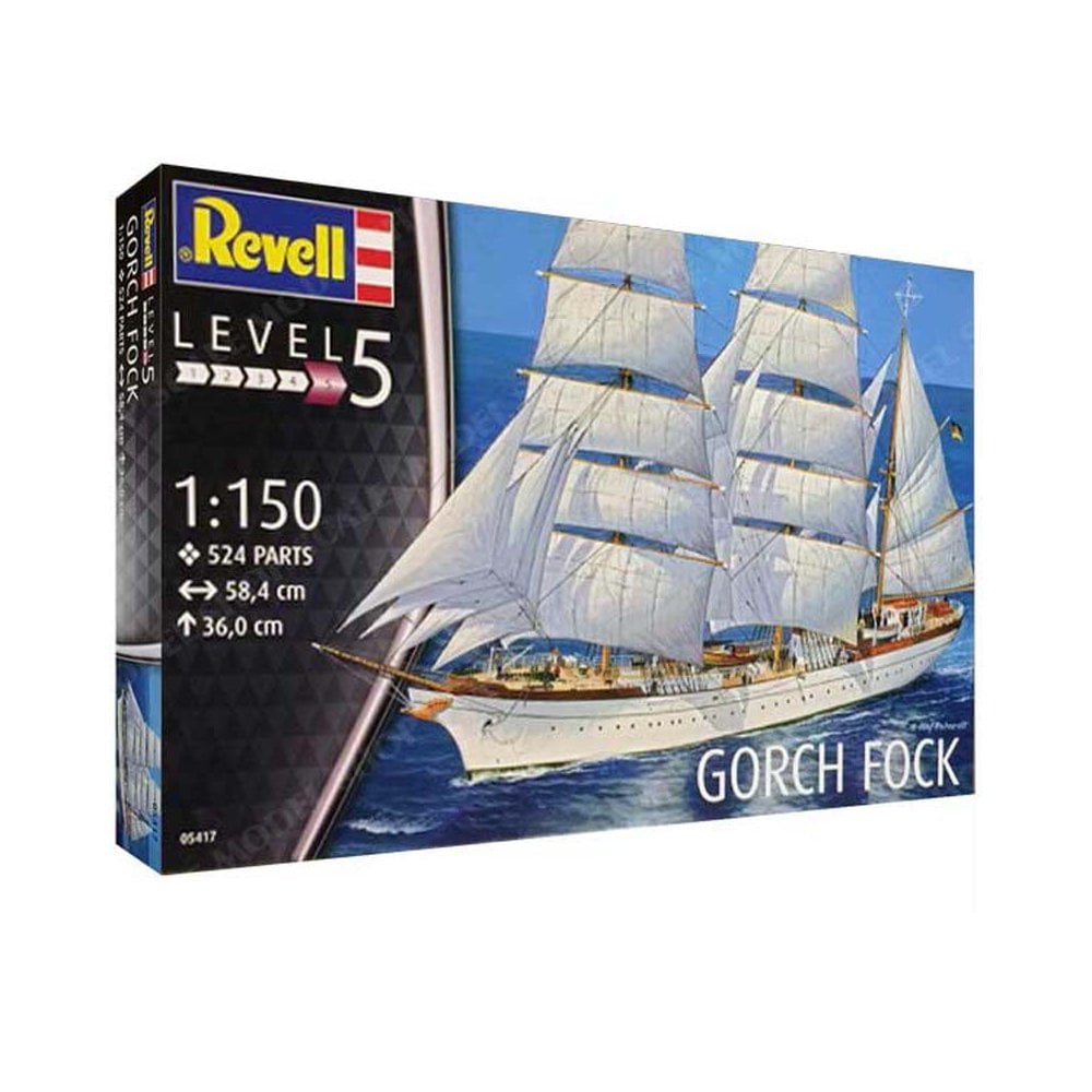 model text A model construction kit of probably the most famous ship of the German Navy, the sail training ship Gorch Fock . – Pre-assembled shrouds – Two piece hull – Fully detailed decks – Motorboats and lifeboats – Fully detailed cabin structures – Helm and ventilation shafts – Masts with structured yard arms – Sail with canvas structuring – Includes yarn for static and running ropes – Display stand – Flag chart on paper – Authentic decal set