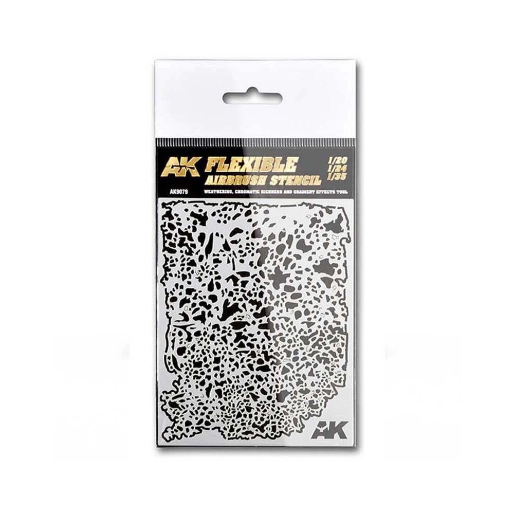 1/20 1/24 1/35 Flexible Airbrush Stencil AK Interactive AK9079The best stencil for your modeling needs. Easily enhance visual interest and createthe perfect background for weathering.The Airbrush Stencil is flexible, easy to adapt, it doesn’t damage the surface, easyto clean and is versatile enough to be used for any scale.-Place the stencil in place.-Start with a color(s) similar to the base color.-Spray layers using highly diluted paint.-Avoid heavy paint accumulations, drips and puddles.-Experiment and have fun, we are making scale models