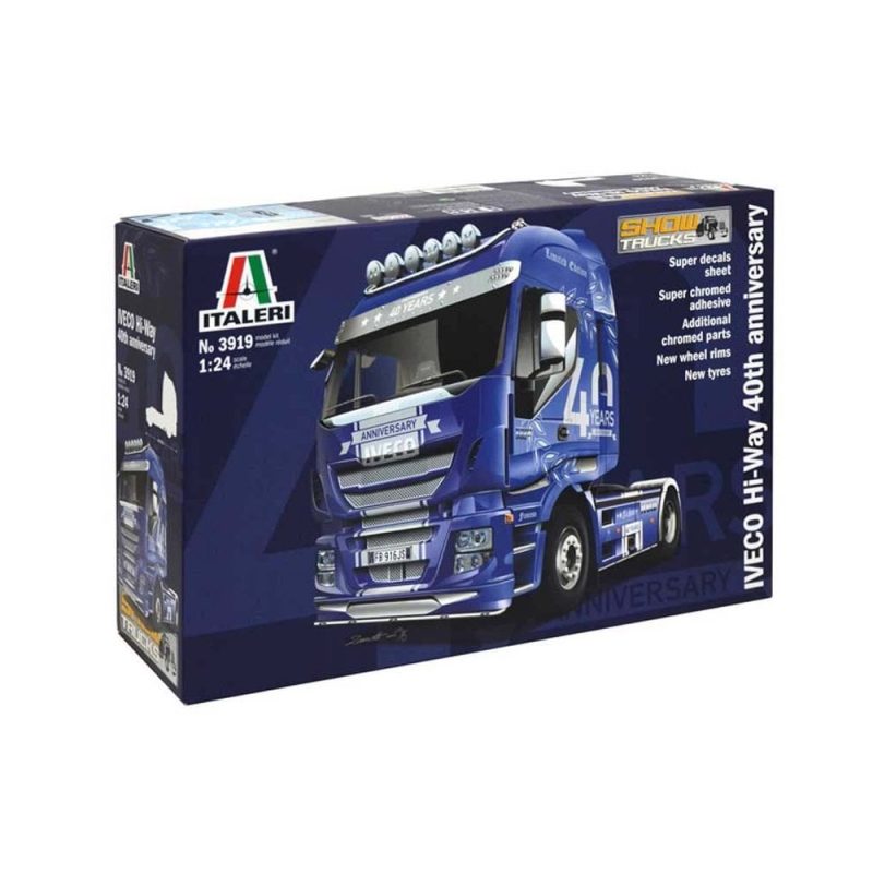 SUPER DECALS SHEET – SUPER CHROMED ADHESIVE – ADDITIONAL CHROMED PARTS – NEW WHEEL RIMS – NEW TYRESIveco, to celebrate the 40 years anniversary from its foundation, has created an exclusive special version of its famous heavy track Stralis Hi-Way. The external design is characterized by a metallic blue livery with gray band that cuts the center grille. The interiors are really excusive with a dedicated set of premium details. The Stralis Hi-Way is the latest evolution of the famous heavy duties truck produced by Iveco. The Stralis Hi-Way is characterized by several technological and aesthetic improvements compared to previous versions. The cabin offers a completely new design and is equipped with integrated electronic systems able to optimize the on-board comfort and to provide the highest safety standard. The evolution of the Stralis is also characterized by a completely new “powertrain” able to minimize the fuel consumption and the maintenance costs. In 2013 Iveco Stralis Hi-Way won the International Truck of the Year award assigned by a pool of journalists of the most important European trucks magazines.