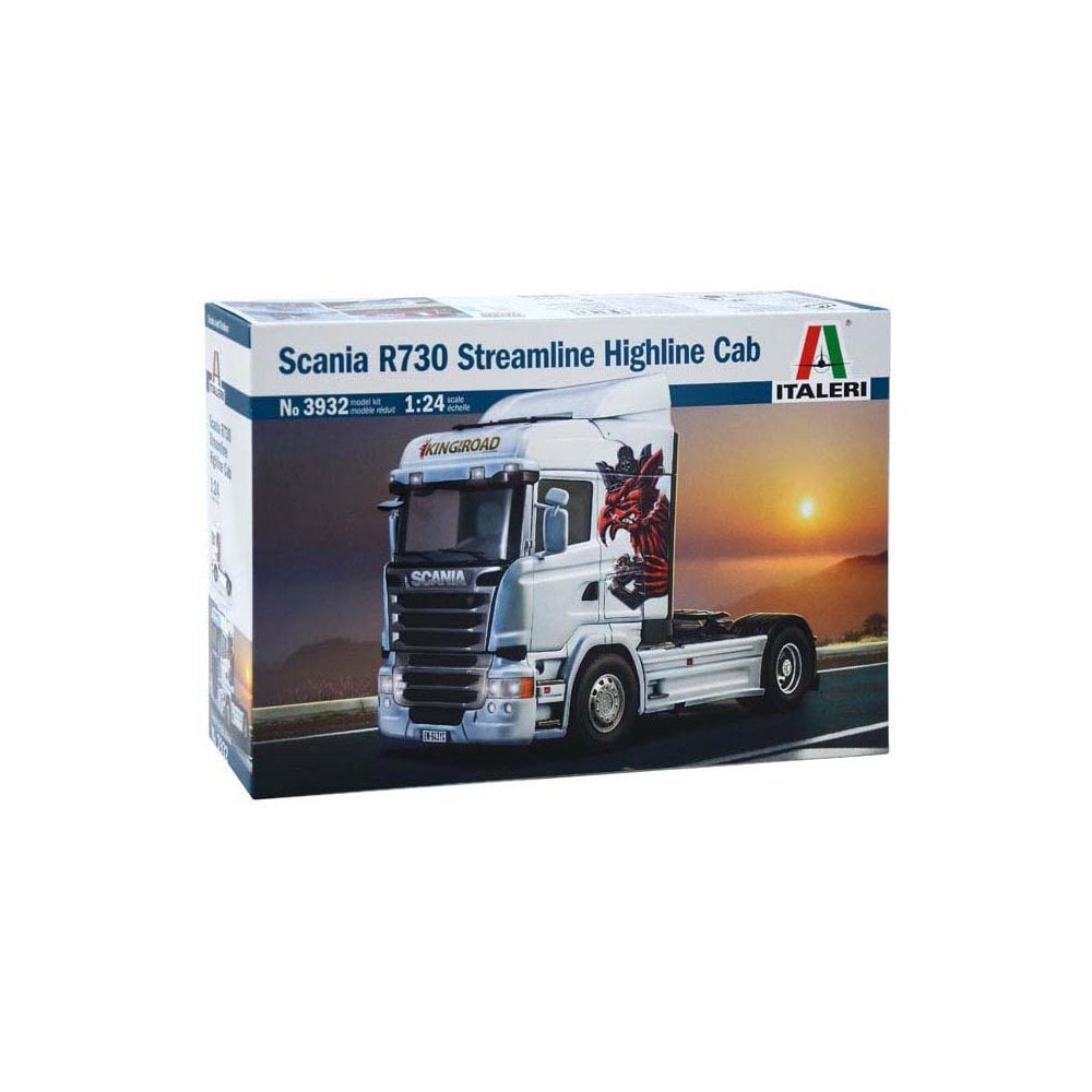 1/24 Scania R730 Streamline Highline Cab 3932 ItaleriThe Scania Series R heavy-tractor is available with V8 engine and has been developed according to the recent World market requirements. The V8 SCANIA engines are designed to carry out the most demanding tasks and are appreciated for their sturdiness, reactivity, and efficiency The continuous evolution of the cabin allowed to reach the highest levels of driving comfort and habitability even in the most demanding long-haul commercial transport activities. The Highline version is able to provide an excellent interior space and an almost flat floor. The new Streamline cabin presented in 2013 has some functional and aesthetic changes that improve aerodynamic and reduce the fuel consumption. Some details, as the smoothed edges or the new deflectors placed above the headlights, are able to reduce the air turbulences and the air resistance. Even the sunshade has a relevant aerodynamic function that improve airflow and characterize the overall truck design.The company introduced its 520 hp and 580 hp Euro 6 V8 engines earlier this year, promising customers it would launch its top-output V8 by years end.Scanias Euro 6 V8 engines are the only ones on the market and the arrival of the 730 hp V8 now gives customers three choices. Customers choose Scania V8s for features including performance, operating economy and durability.Sheer power never goes out of style, says Christopher Podgorski, Senior Vice President Trucks at Scania. Our customers buy V8 trucks for many different reasons, but an understandable need for performance is always one of them. The fact that our customers buy V8 trucks over and over again proves that they are durable and offer unsurpassed productivity as well.Scanias legendary V8 engines were first introduced in 1969 and have established a unique market position all over the world. Scanias 730 hp engines have a reputation for offering never-ending power, high productivity and a lasting value.All three Scania V8 engines are based on the 16.4-litre platform that was originally introduced with the 730 hp engine in 2010. Scanias Euro 6 V8 engines use a water-cooled EGR system combined with SCR technology and a variable geometry turbo in order to achieve Euro 6 emission levels. The silencer unit is only slightly bigger than the best-in-class unit used for Scanias inline six engines. This means that generous chassis space is left for fuel tanks and AdBlue tanks.V8-equipped Scania trucks are used wherever there are demanding tasks. The 520 hp is likely to become a favourite among many long-haulage customers, due to its endurance and capacity to deal with undulating roads while maintaining reasonable fuel consumption. The 580 hp version offers all the performance of the previous 620 in Euro 5.The 730 hp version, on the other hand, is of course not the engine for any odd job. 60-tonne timber trucks in the Nordic countries, heavy-haulage in Germany and heavy-duty general haulage in Norway are examples of applications where 730 hp Scania V8s thrive and excel.The 730 hp Euro 6 Scania V8 has an even more impressive torque curve, compared to its Euro 5 predecessor. Scanias engineers have created a wider or fatter torque curve which means that maximum torque is available from 1,000 r/min all the way up to 1,400 r/min. The reinforced automated gearbox with Scania Opticruise is fitted as standard to handle the power.Scanias V8s are only available together with Scanias premium R-cabs. The Scania V8s can be combined with a variety of gearboxes, rear axles with or without hub reduction, and tandem bogies with either single reduction or hub reduction