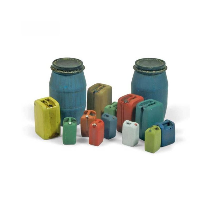 Fourteen assorted modern plastic drums used for transport of liquids, in different sizes, from size 10 to 120 liters.Accessories supplied unpaintedScale 1/35(x14)