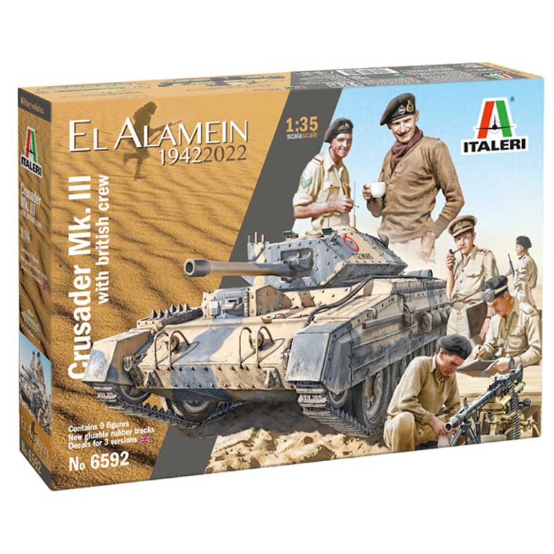 DECALS SHEET FOR 3 VERSIONS – NEW GLUABLE RUBBER TRUCK – COLOR INSTRUCTION SHEETCONTAINS 9 FIGURESDesigned at the beginning of the Second World War, the Crusader was one of the most important British “Cruiser” tanks reaching a production of over 5,000 units. Equipped with Christie suspension with large diameter rolling wheels, the Crusader possessed remarkable driving skills on rough terrain. The first versions of Mk. I and Mk. II were armed with a 2 pdr cannon. later replaced by the more powerful 6 pdr cannon. in the Mk.III version. Lacking adequate armor against enemy fire, it was also very vulnerable to enemy mines and anti-tank guns, and its armament was often inadequate in front of similar German vehicles. However, when used in a coordinated way, they managed to achieve good results.