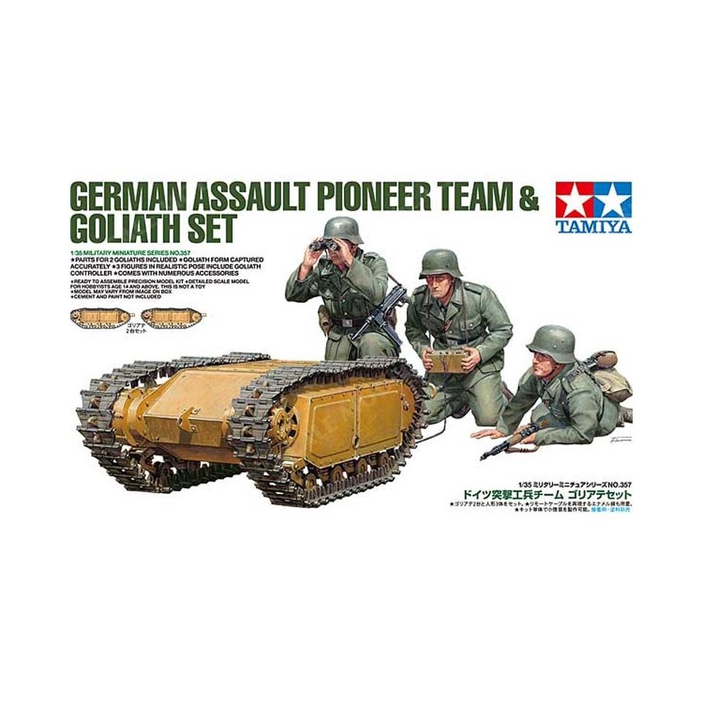 This 1/35 scale model kit from Tamiya recreates a German assault pioneer team with the Goliath tracked demolition vehicle. The Goliath was a small, remote-controlled explosive carrier designed to disrupt enemy fortifications and armoured targets. Roughly 1.5 metres in length, it could carry up to 60 kilograms of explosives and was controlled via a wired remote system. Used predominantly by Sturmpionier (assault pioneer) units, the Goliath provided a method of engaging enemy positions without exposing personnel to direct fire.