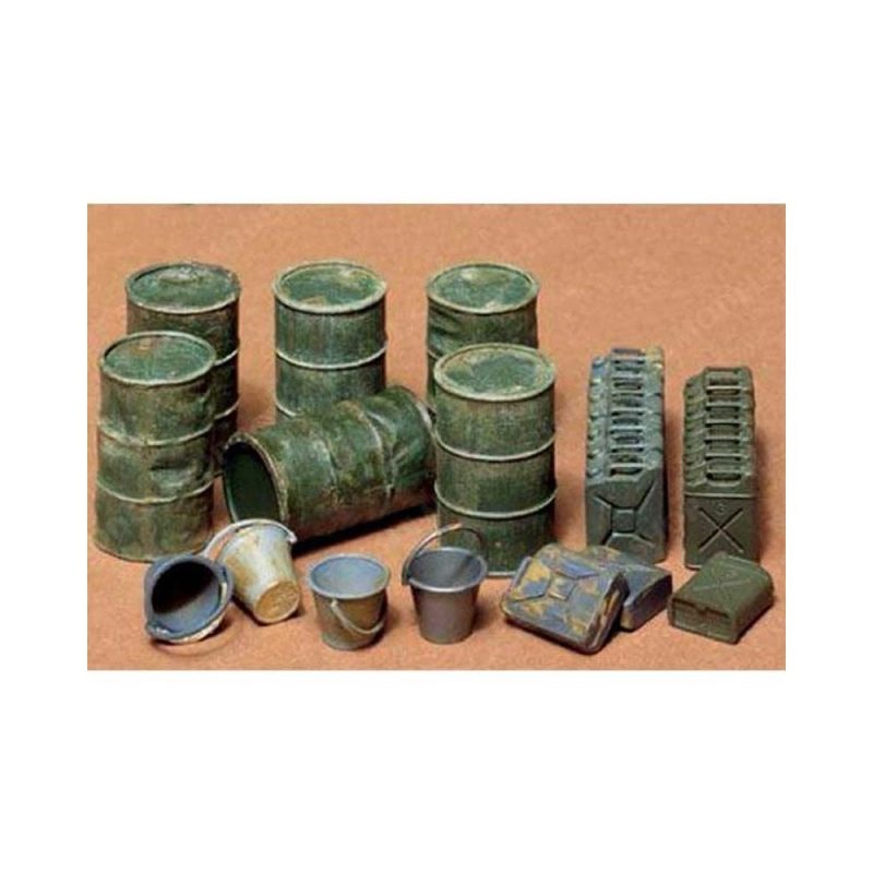 This 1/35 scale set from Tamiya recreates both Allied and German jerry cans used extensively during WWII for the storage and transport of fuel and water. The set includes accurate reproductions of the distinctive German three-handle design and the simpler Allied style. Each can features finely detailed caps, weld seams, and embossed markings to enhance realism.
