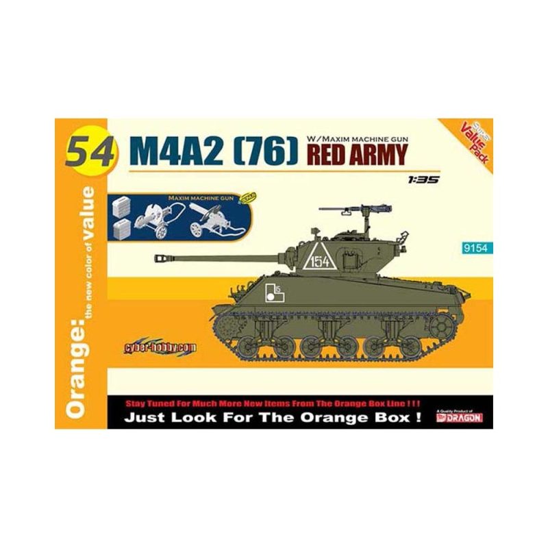 The next Cyber-Hobby Orange Box new item comes as a Red Army M4A2(76) tank. A total of 4,102 M4A2 medium tanks were sent to the U.S.S.R. under Lend-Lease. To make the kit more valuable, the kit also includes a fine 1/35 scale Maxim machine gun as well!