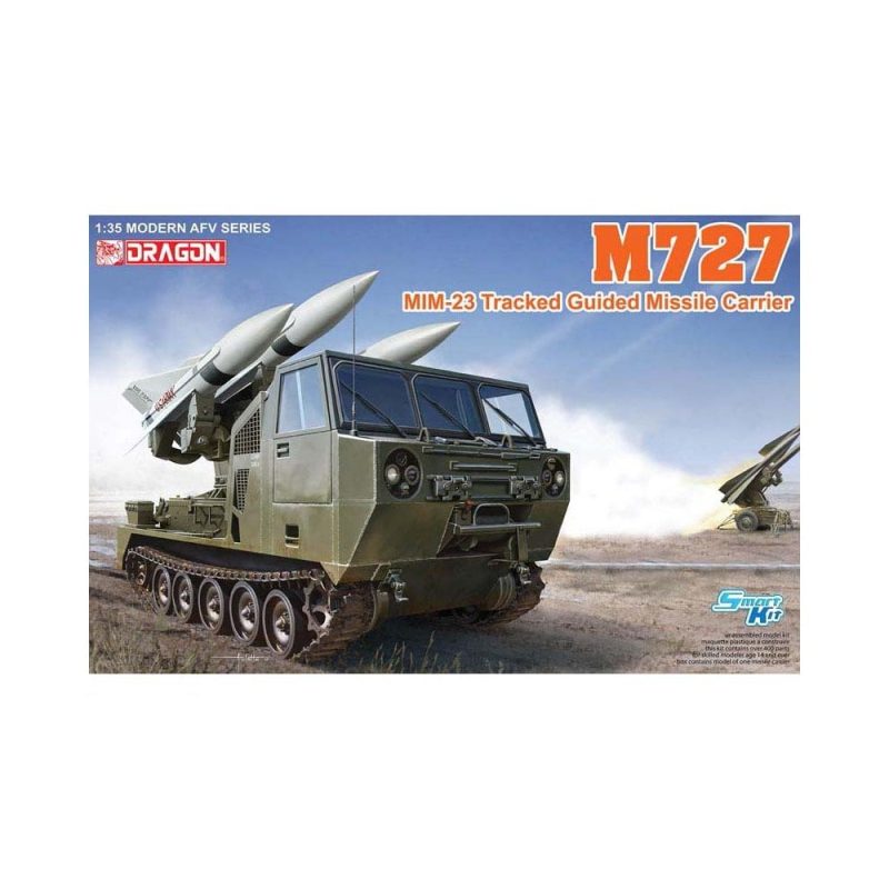 1/35 M727 Mim-23 Missile Carrier D3583 DragonDragon has added yet another surprising sensation to its range of 1/35 scale modern vehicle plastic kits. The beneficiary this time is an M727 Tracked Guided Missile Carrier. This surface-to-air missile (SAM) system essentially mated an M754 guided missile launcher with an M548 tracked chassis to achieve high mobility. The MIM-23 missile is actually an acronym for Homing All-the-Way Killer. The US Army introduced the missile in 1959. The M727 gave the US Army its first mobile medium-range SAM, with up to three missiles mounted on a swiveling launcher on the rear of the vehicle. The Launch system can traverse through 360, while the missiles can be elevated according to the modelers wish. Everything on the M727 is new-tooled, except the tracks, road wheels and lower hull are sourced from previous releases. Even though the M727 Tracked Guided Missile Carrier had a relatively short lifespan, it deserves to be recognized in this the worlds first 1/35 scale plastic kit!
