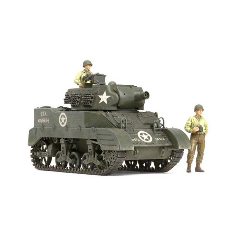 This 1/35 scale Tamiya kit recreates the U.S. M8 Howitzer Motor Carriage, a light armoured support vehicle based on the M5 Stuart chassis and armed with a 75mm howitzer. The model includes three realistically posed crew figures, perfect for diorama settings depicting U.S. forces in WWII. The kit features finely moulded parts and an accurate representation of the open-topped turret and internal details.