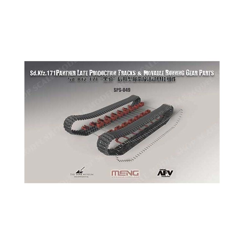 The MENG SPS-049 Sd.Kfz.171 Panther Late Production Tracks & Movable Running Gear Parts contain something new from our team. Thanks to the steel torsion bars, the whole suspension system is more reliable. The workable tracks fitted with metal pins are excellent. What’s more, we have four different Zimmerit decals (SPS-050, SPS-051, SPS-052,SPS-053) for the Panther Ausf.A version too. These accessories will make your Panther model look more attractive.