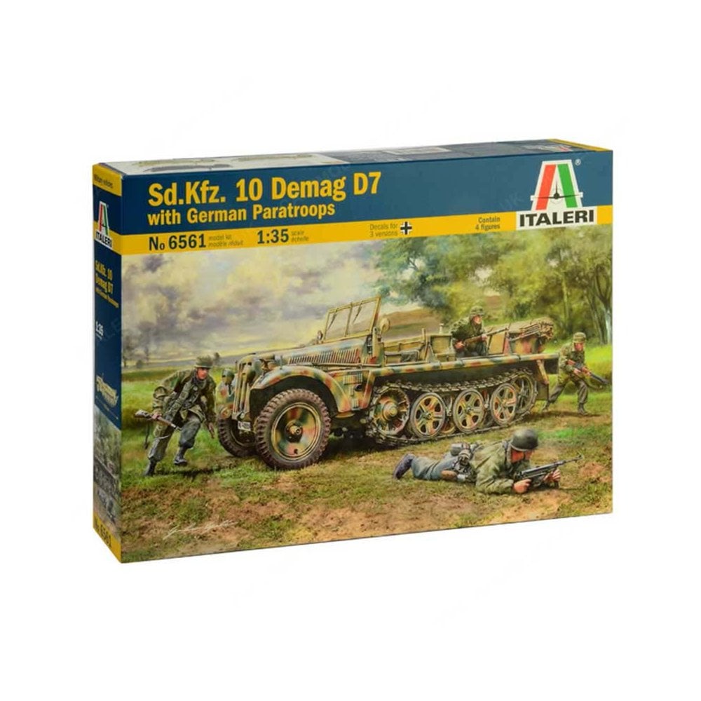 1/35 Sd.Kfz. 10 Demag D7 & German Paratroops Italeri 6561The Sd.Kfz 10 Demag D7 half-track was used by the German troops in large numbers during the Second World War on all the main fronts from the invasion of Poland, to North Africa, to Russia. It was design and developed to be an effective prime mover for small towed artillery as anti-aircraft and anti-tank guns. The Demag D7 could carry eight fully equipped soldiers in addition to towing a gun or a trailer. The 4.2-liter Maybach 6-cylinder engine , positioned in the front of the vehicle, could delivered 99 hp. Thanks to its engine the half-track was able to reach a max speed of 65 km/h and to have a good on road and off road performance. The vehicle was reliable and flexible and it was produced in an important number of units and in several versions. Its frame was also the base to implement modifications and improvements directly from the field workshops in order to have vehicles fully in line with the specifics of the operating theaters.