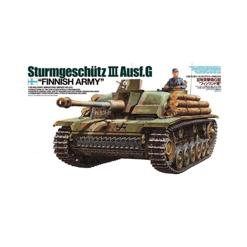 This 1/35 scale Tamiya kit recreates the Sturmgeschütz III Ausf.G as operated by the Finnish Army during WWII. Based on the reliable Panzer III chassis, the Ausf.G variant featured a fixed superstructure mounting a powerful 75mm StuK 40 L/48 gun. The Finnish Army acquired these vehicles from Germany between 1943 and 1944, designating them as Ps.531-xx. They were deployed effectively in defensive operations on the Eastern Front, where their low profile, strong armour, and accurate firepower proved decisive in anti-tank roles.