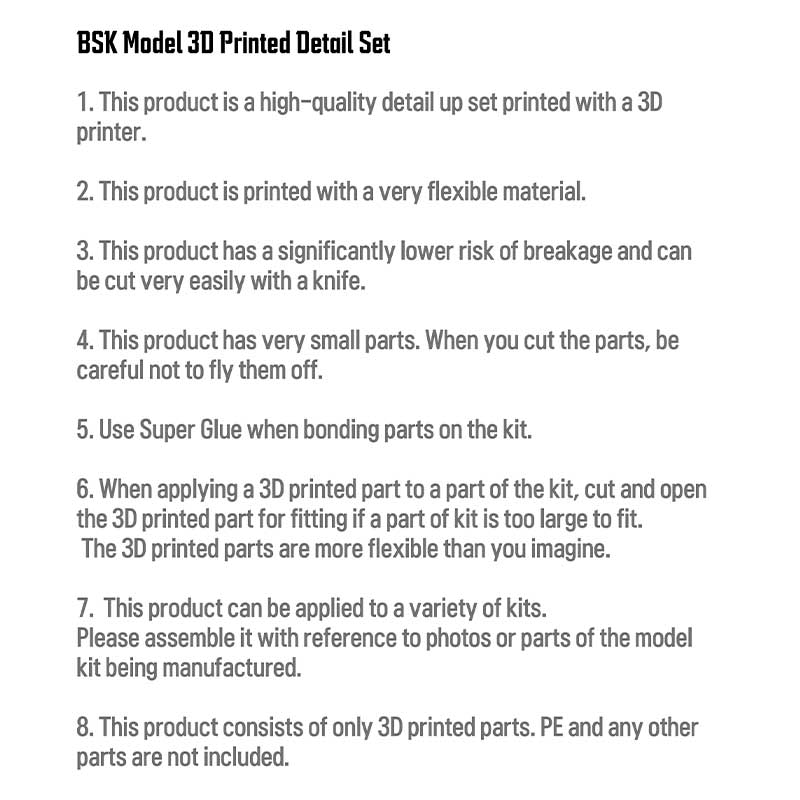 Discover the exceptional craftsmanship of BSK Model, a leading South Korean company renowned for its high-quality 3D printed detail sets designed specifically for scale model kits. Each product is meticulously crafted to enhance your modelling experience, providing intricate details that elevate your projects to a professional level. With BSK Model, you can transform ordinary kits into extraordinary masterpieces.