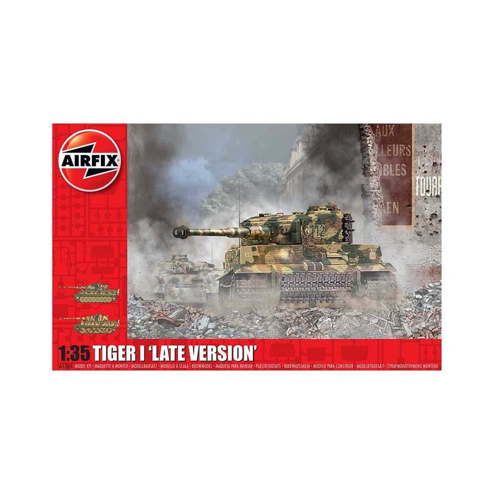 1/35 Tiger-1, Late Version Airfix A1364During the whole of its service history, the Tiger-1 was constantly improved upon and adapted to counter the ever-improving Allied tanks and firepower it found itself up against. This version from the summer of 1944 comes with a asymmetric turret, 88mm cannon, mantlet, engine deck and accessory pack. A Zimmerit tool is also included.