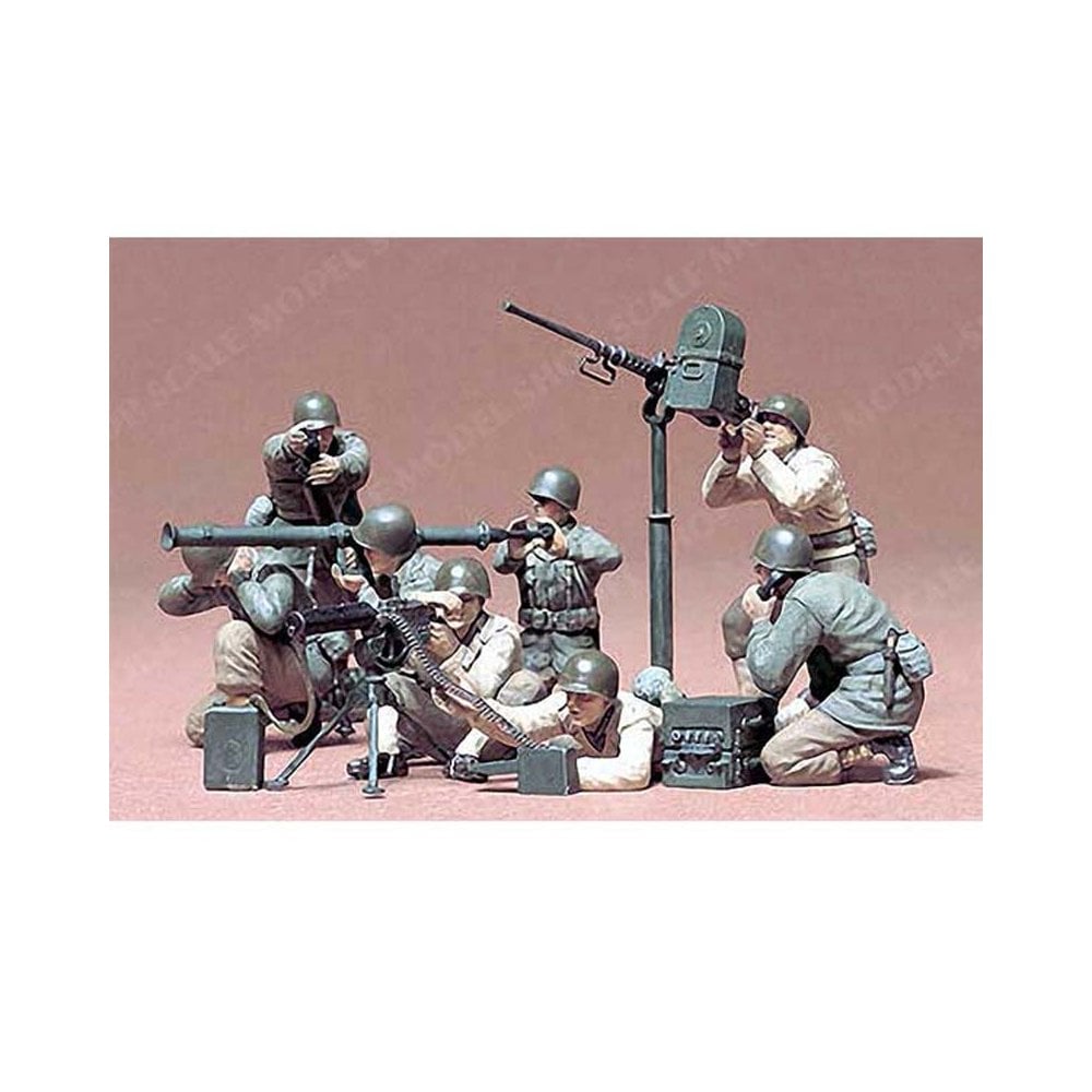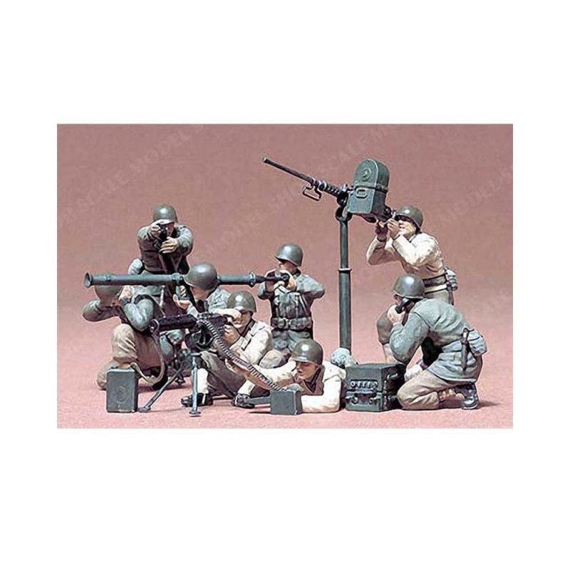 This 1/35 scale Tamiya kit depicts a detailed U.S. Army gun and mortar team, perfect for enhancing World War II diorama scenes. It includes multiple figures in dynamic poses, operating both a machine gun and a mortar, providing a realistic representation of infantry fire support units in action.