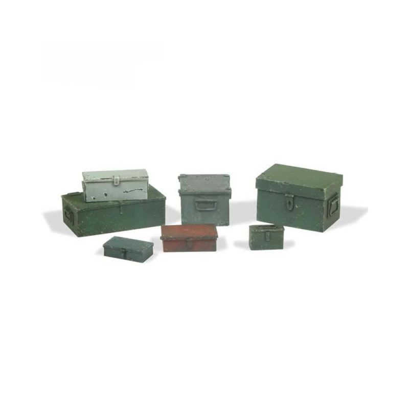 Seven metal cases of different sizes and designs, used for the transport and storage of military equipment. The cases can be placed on vehicles or dioramas.Supplied unpainted.Scale 1/35(x7)