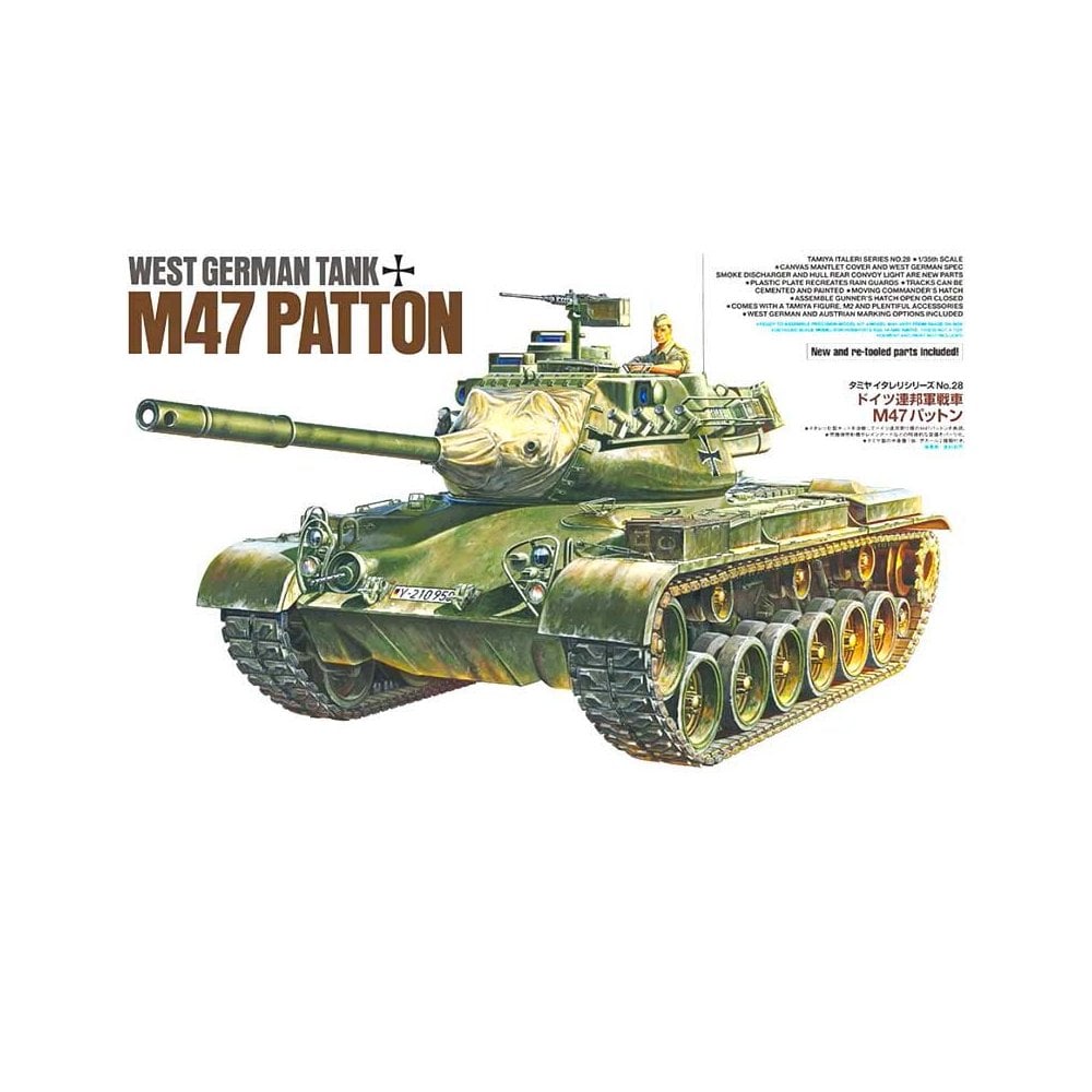 This kit is a Tamiya-Italeri Series collaboration. The kit itself is a significantly updated version of the original Italeri M47 Patton combined with Tamiya figures, machine gun parts, plus new West German markings and parts, as well as Tamiya instructions. The M47 Patton began deployment in 1952, but was rather quickly superseded by the M48; M47s were thus supplied by the U.S. to friendly nations in the west such as Italy and West Germany.