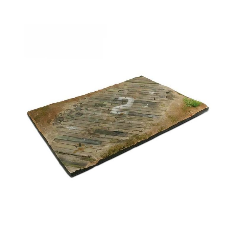 This base, an improvised section of wooden planks, is a landing area for aircraft in 1/48 scale which also permits the placement of any type of vehicle in scale 1/35. The base has the texture of weathered wood, as well as an area of ground next to the wood surface.Base supplied unpaintedScale 1/3531≥21 cm/12,20≥8,26 in