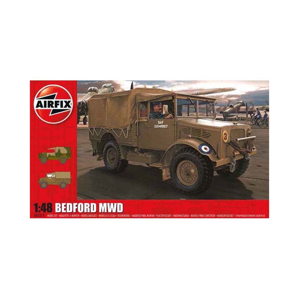Scale: 1:48Skill: 2Flying Hours: 1Number of Parts: 95Dimensions (mm): L89 X W41The Bedford MW series was the smallest of the wartime Bedford trucks and many thousands were produced throughout the Second World War. Early models earned the nickname the ‘Pneumonia Wagon’ due to their small windscreens and open cabs.These early models helped transport the British Expeditionary Force across France in 1940 and by the end of the summer some had found their way onto airfields during the Battle of Britain. By the middle of the war the MWD had been updated, with an enclosed cab giving better weather protection for the crew. These variants were very useful on RAF bases, helping to transport crews and material to waiting aircraft.