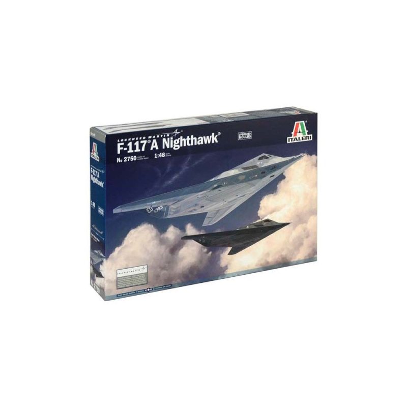 1/48 F-117A Nighthawk Italeri 2750F-117 A NIGHTHAWKUPGRADED MOULDS – SUPER DECALS SHEET FOR 2 VERSIONS – COLOR INSTRUCTIONS SHEETThe single-seat attack aircraft F-117 Nighthawk was developed by Lockheed Martin and operated by the United States Air Force. The first prototypes were released in the 80s but the Nighthawk project was considered classified for several years. The F-117 was in fact developed on advanced stealth technologies designed to avoid detection and to reduce reflection and radar emission. To enhance the stealth features, the offensive armament was located in two internal weapons bays able to carry more than 2,200 Kg of bombs as the laser-guided GBU Paveway or the JDAM (Joint Direct Attack Munition) bombs. Thanks to its two General Electric turbofans engine the F-117 Nighthawk was able to reach the max speed of Mach 0.92. The F-117 obtained a very high media visibility during the Gulf War in 1991 and during the Balkans War.