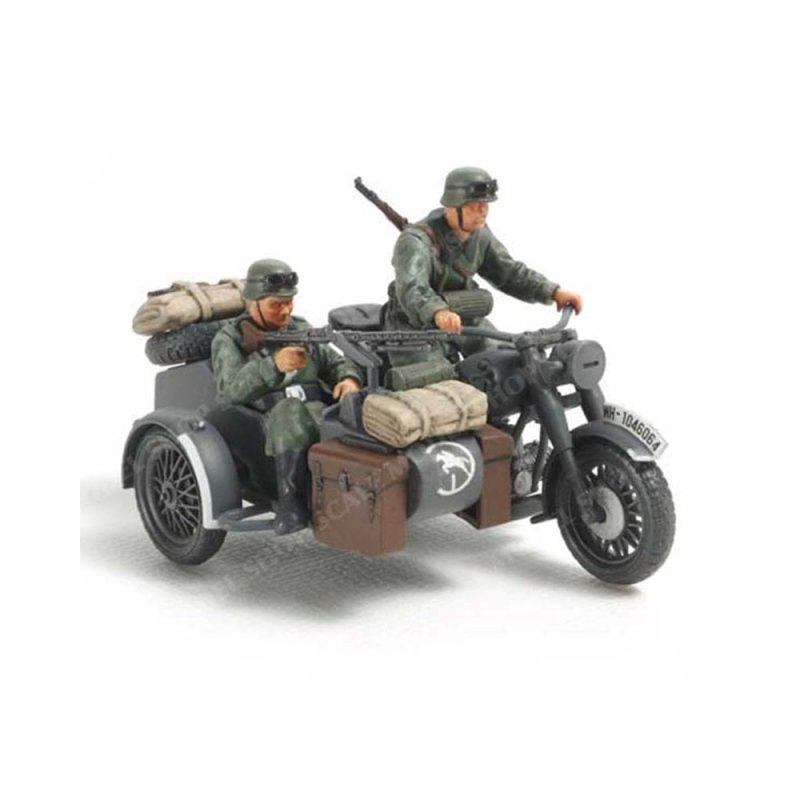 This 1/48 scale model depicts a German motorcycle with sidecar, a vehicle combination widely used by German forces during WWII. Known for their excellent off-road ability and dependable performance, these combinations were deployed across multiple theatres for transporting soldiers, equipment, and important dispatches. In some cases, sidecars were even equipped with machine guns for light fire support, enhancing their battlefield utility.