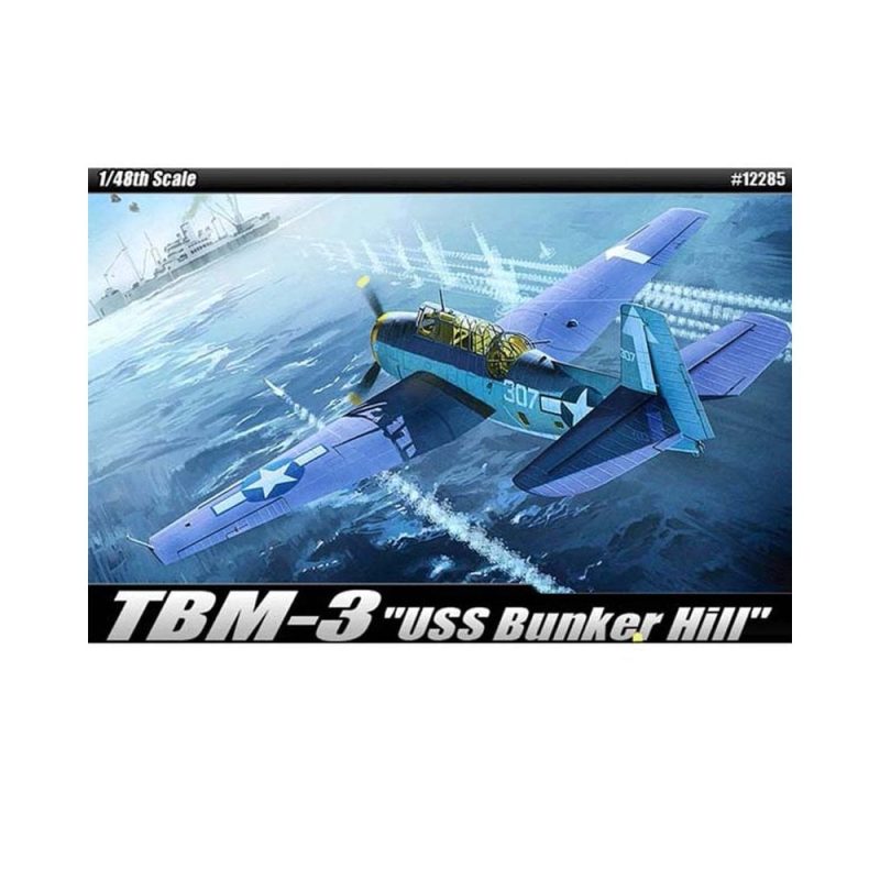 The Academy 12285 kit represents the Grumman TBM-3 Avenger torpedo bomber as operated from the USS Bunker Hill during WWII. Produced in 1/48 scale, this model captures the Avenger’s robust design, including its spacious cockpit, folding wings, and internal torpedo bay. With detailed moulding and authentic decal options, it allows modellers to recreate one of the most important carrier-based aircraft of the Pacific theatre.