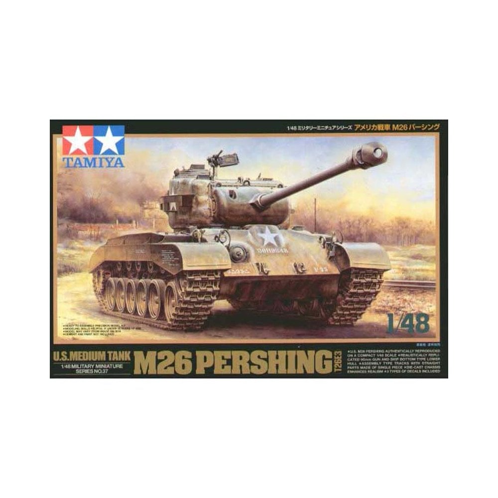 This 1/48 scale assembly kit from Tamiya depicts the US M26 Pershing, a powerful medium tank introduced late in WWII to counter heavily armed German armor. Armed with a 90mm M3 gun and protected by thick frontal armor, the Pershing provided the US Army with a much-needed upgrade over the M4 Sherman, proving effective in both firepower and survivability. It saw combat in the final months of the European campaign, including notable actions during the Battle of the Ruhr and in crossing the Rhine.
