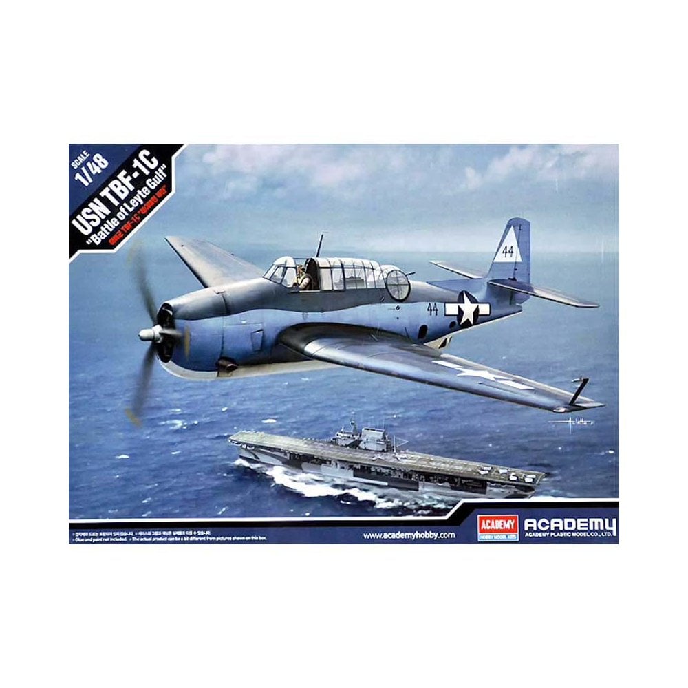 The Academy 1/48 USN TBF-1C Avenger “Battle of Leyte Gulf” kit captures one of the most significant naval battles of World War II. This detailed kit provides multiple decal options representing aircraft from various US Navy squadrons that took part in the action during 1944.