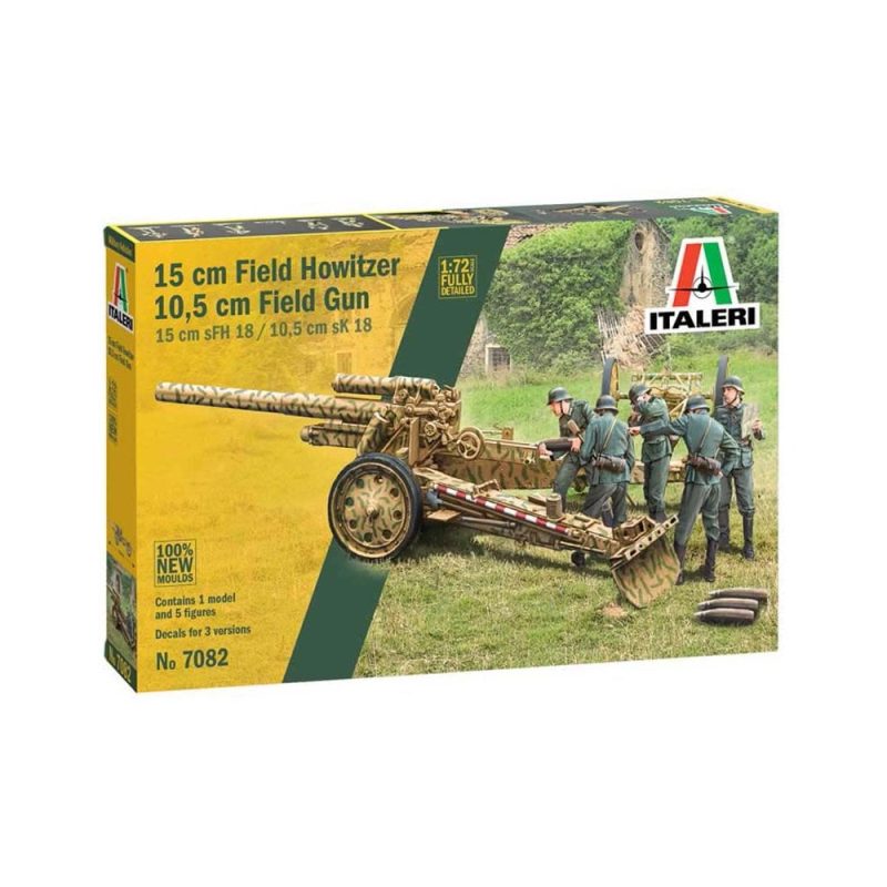1/72 15 Cm Field Howitzer / 10,5 Cm Field Gun Italeri 7082100% NEW MOULDS – FULLY DETAILED MODEL – DECALS FOR 3 VERSIONS – COLOR INSTRUCTIONS SHEETCONTAINS ONE MODEL AND 5 FIGURESThe 150 mm SFH18 howitzer was widely deployed by the Wehrmacht on all of the key fronts during WW11. It was developed during the 20s and 30s by Rheinmetall and Krupp, one of the main artillery companies in Germany, with a view to optimizing resources and technological capabilities within the parameters imposed by the Treaty of Versailles. From 1933 onwards, Germany’s rearmament planning became ever more ambitious, with a particularly significant increase in the production of howitzers and field cannons. The SFH18 had a simple and reliable structure with a maximum range of 13.5 km. It could be divided into two sections and towed by horses, or more often during the war, by half-tracks. The SFH18 had a seven man crew. A 105 mm caliber version was developed on the same carriage, (sK 10,5 cm)which was characterized by the longer barrel, but was produced in few specimens as much heavier than the standard 105 mm leFH18, which was the field artillery cannon supplied to the Wehrmacht.