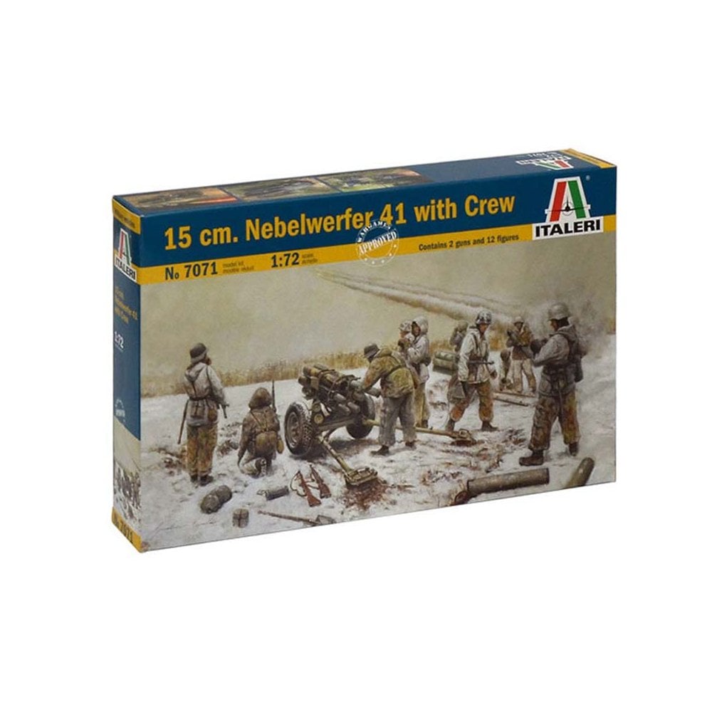 The Nebelwerfer was an extremely effective weapon that flanked,during the Second World War, the artillery troops of German Army. The 15 cm Nebelwerfer 41 was probably oneof the versions with highest rate of production and use. It was built by a six-tube rocket launcher and itwas able to use gas, smoke and high-explosive warheads.It was mounted on a towed carriage adapted from thatused by the Pak 36 ,able to provide a good mobility and flexibility of use. The 15 cm NbW 41 has a range ofalmost 7,000 meters.Type: Figure SOLDIERSPeriod: Second World WarCountry: GermanySkill: 2Box Dim.: 258 x 162 x 38 m