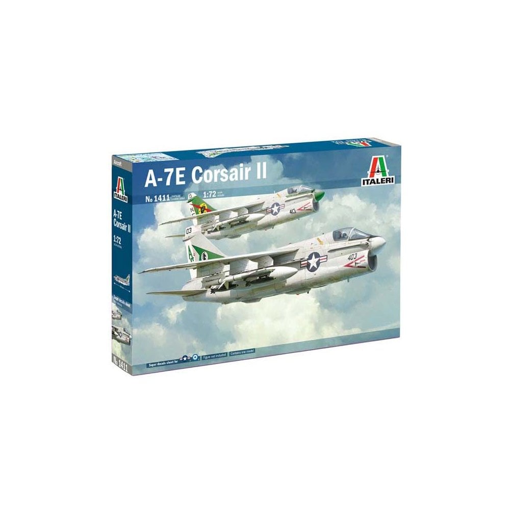 1/72 A-7E Corsair II Italeri 1411COLORS INSTRUCTIONS SHEET – SUPER DECALS SHEET FOR 4 VERSIONSThe LTV A-7 Corsair II was designed and implemented in the first half of the 1960s to satisfy the specific United States Navy request to have a new carrier-capable light attack aircraft able to replace the Douglas A-4 Skyhawk and the piston-powered Douglas A-1 Skyraider. It was directly developed by the fighter Vought F-8 Crusade airframe. The A-7 was characterised by the large frontal air intake under tha cabin, by the 35 foldable swept wing to optimize the use and the storage on the aircraft carriers flight decks and by the adoption of a modern Head-up-Display to enhance the operational effectiveness. Thanks to its underwing hardpoints the A-7 was able to carry an impressive offensive load based on conventional bombs, guided bombs as the Paveway and air-to-surface missiles. The A-7E was the last version produced for the U.S Navy with an improved operational capabilities and the possibility to use the Harpoon anti-ship missiles and the AGM-88 HARM anti-radiation missiles.