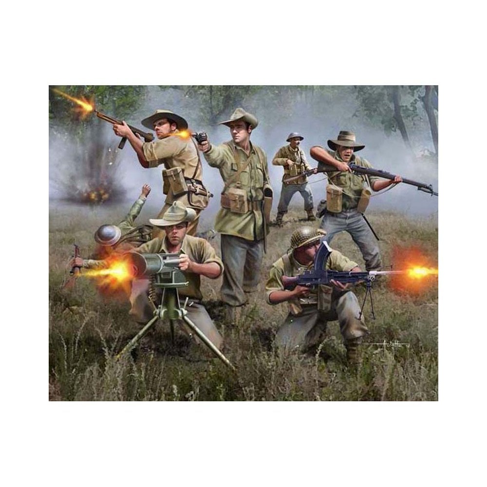 Product description As a member of the British Commonwealth, Australia supported the mother country,Great Britain, in many wars. During the first half of World War II, Australia troops fought against the German armed forces in North Africa, Greece and Crete.After Japan joined the war, the main war scene for Australia shifted to the Pacific region where they helped to defeat Japan.This set includes 49 unpainted figures! Product specifications number of figure 49number of parts 52