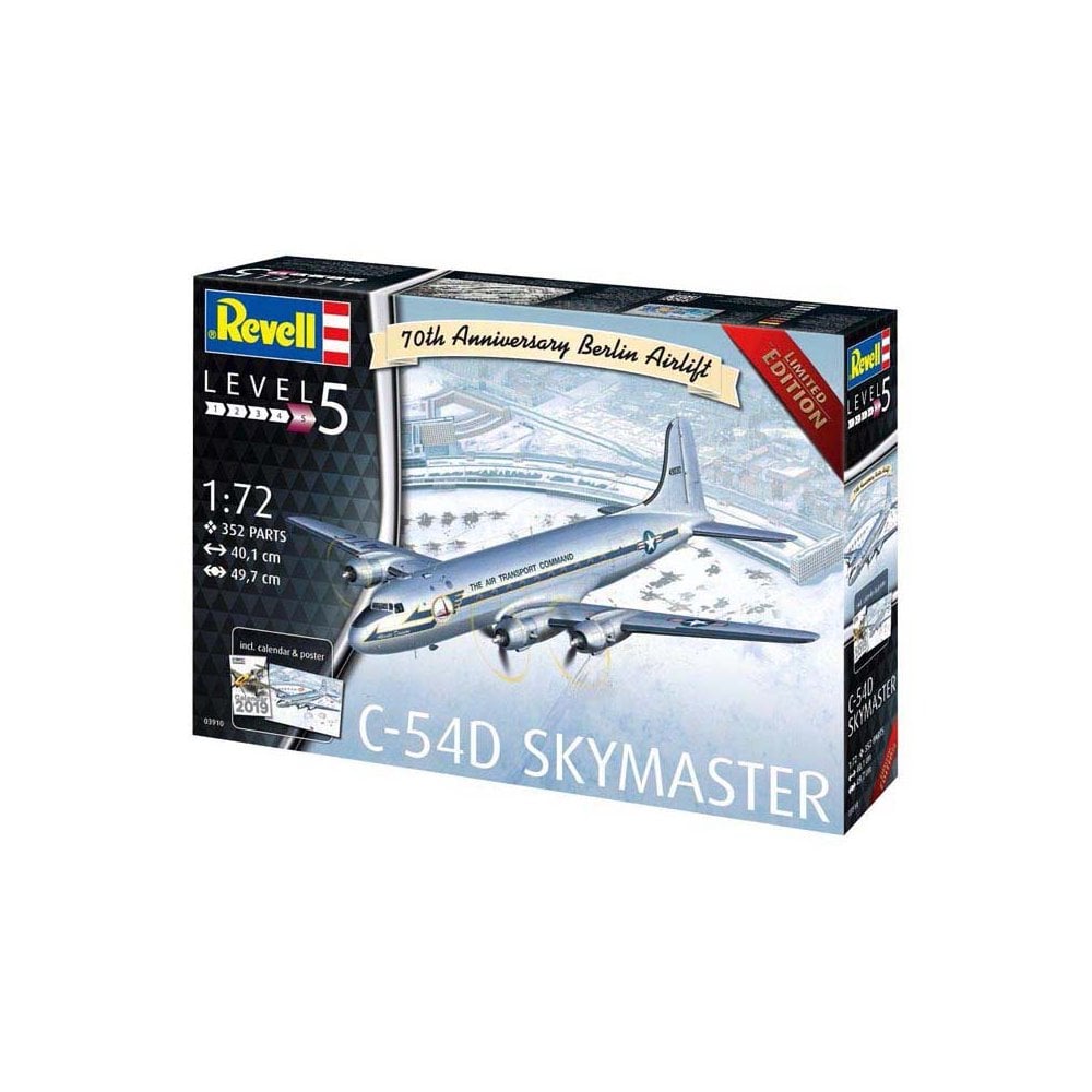 03910, Gift Set – C-54D ‘Berlin Airlift 70th Anniversary’ (LIMITED EDITION)One of the first major incidents of the Cold War was the USSR’s blockade of West Berlin, effectively cutting off more than 2 million people. Western air forces immediately swung into action to start what is now referred to as the Berlin Airlift. Lasting from June 1948 to May 1949 these aircraft, many of them C-54D Skymaster transports, delivered around 2.1 million tonnes of essential food, fuel and other supplies to keep the city alive. Revell’s highly detailed model features full cockpit, cargo bay, undercarriage, engines, propellers and moveable control surfaces. This special edition Gift Set also includes; Contacta Professional cement, paintbrush, selected Aqua acrylic paints, A2 reproduction box art poster and Revell 2019 calendar.