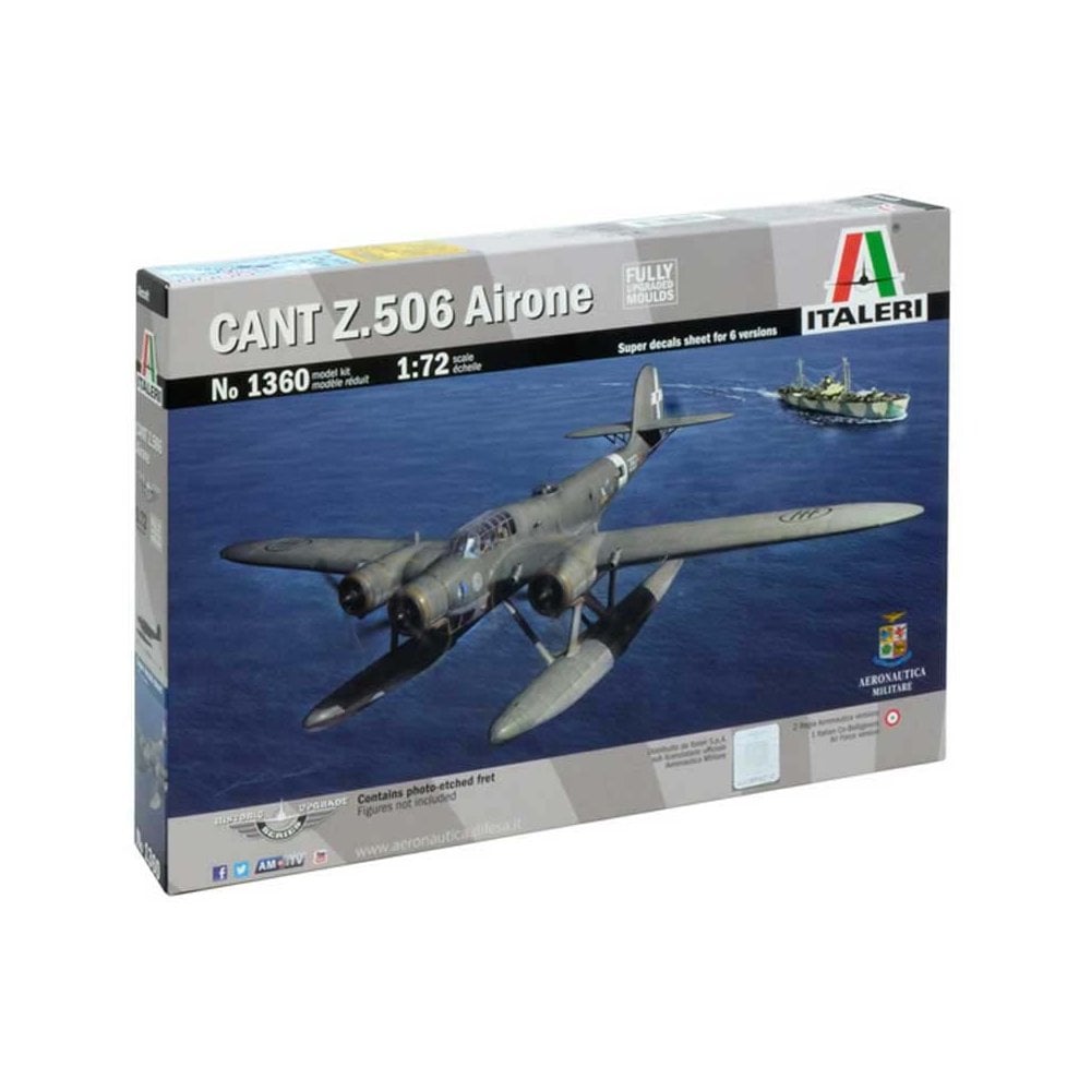 CANT Z 506 AIRONEFULLY UPGRADED MOULDSSUPER DECALS SHEET FOR 6 VERSIONS – PHOTO ETCHED INCLUDED – COLORED INSTRUCTION SHEETProduced by the Italian company C.R.D.A. (Cantieri Riuniti dell’Adriatico), the CANT Z 506 Airone (Heron) was a triple-engine, low-wing floatplane characterized by an extraordinary reliability and robustness. It entered in service in the second half of the 30s. Despite the fuselage and the wings based on wooden structures, the Airone was able to operate in very bad weather conditions. It was used by Italian Regia Aeronautica as bomber and long range maritime reconnaissance aircraft. It was also used to perform search and rescue duties on the sea. The good flying performance are proved by the extraordinary longevity. Some 506 examples survived in post-war service until 1960 and they have been used as S.A.R. planes by Italian Air Force