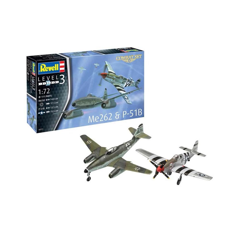 Model kit consisting of the American P-51 Mustang and the German jet fighter Me262. These fighters were used in major air battles that were going on during the last few days of the Second World War.