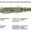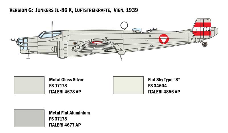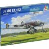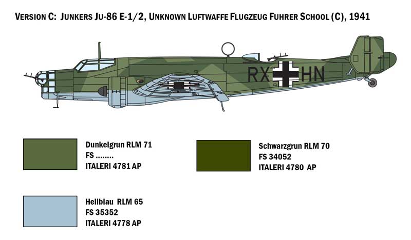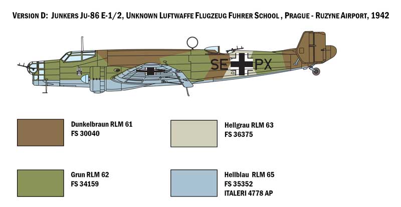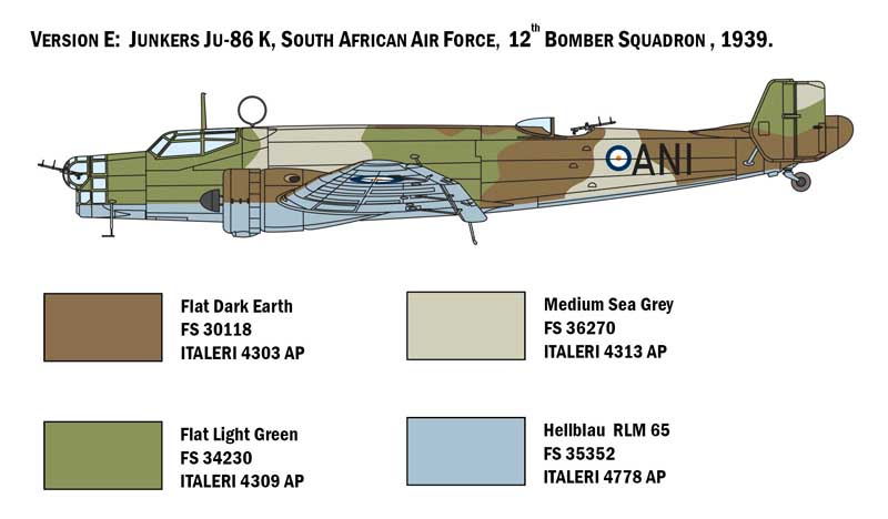 1/72 JU 86 E1/E2 Italeri 1391COLORS INSTRUCTIONS SHEET – SUPER DECALS SHEET FOR 7 VERSIONSDuring the 30s, the German aviation industry developed passenger or postal transport airplanes that could be easily declined and converted into military versions. Officially set up to be a civilian airplane to perform commercial duties, the Junkers Ju 86 was a monoplane twin-engine aircraft that, in the bomber version, equipped the squadrons of the nascent Luftwaffe. The Junkers Ju-86 was used, similarly to the Heinkel He 111 and the Dornier Do-17, as a medium-range bomber during the Spanish Civil War in 1936 under the Condor Legion insignia. Thanks to its two Junkers Jumo 205 engines, the Ju-86 was able to reach the maximum speed of 300 km / h and to carry up to 1,000 kg of offensive load. The Junkers Ju-86 participated to the early stages of the Poland Campaign but it was soon replaced by more modern and effective aircrafts. In addition to the Luftwaffe, it was used by Swedish and Hungarian air forces.