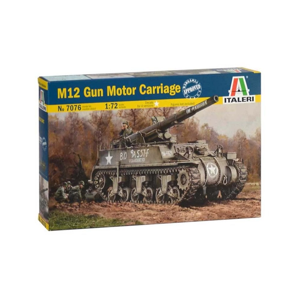 1/72 M-12 GMC Italeri 7076COLOR INSTRUCTION SHEETThe self-propelled gun GMC M12 was used during the Second World War by the U.S. Army. It was developed on the hull of the M3 Lee / Grant tank on which was installed the original French GPF 155 mm gun. The main armament, the ammunitions and the gun crew were located in an open topped area at the back of the vehicle. Only the driver’s and the radio operators seats were protected. To absorb the effects of the recoil when using the artillery piece, the M-12 was equipped with a rear blade that was lowered and fixed into the ground.