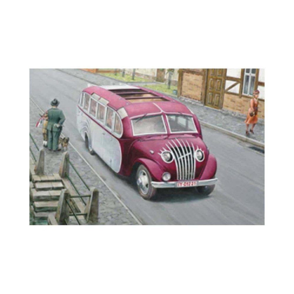 1/72 Opel Blitzbus Strassenzepp Essen Roden 725At the beginning of the 1930’s Germany gradually recovered after the protracted economic depression caused by the aftermath of WWI and the stormy political events of the Twenties. The rise of Adolf Hitler, who set out the goal of renewing the political role and importance of Germany, which it had had before the Great War, became the spur for a rapid growth in diverse sectors of industry, including the automobile industry. However, Germany, although the motherland of the automobile as such, had allowed other countries to take up the leadership of the motor industry during the early years of the 20th Century; first of all France and England, and these countries had become the trendsetters in motor vehicle development.In the middle of the Thirties the renowned designer Ferdinand Porsche proposed the concept of a “folk car” to Hitler. He developed a small automobile, which then became one of the classics of the motor industry, the VW Beetle. The elegant contours of this car inspired a real boom among German auto designers. Cars of previous years had a body of distinct and separate forms, amongst which were distinguished a hood, rear body, boot, etc. Now a preference was given to the construction of cutting edge aerodynamic forms, and soon these new features were widespread not only on automobiles but also on trucks, buses and even passenger-trains.The small truck body workshop of Ludewig Brothers in the German city of Essen had been installing bodies of their own design on the chassis base of trucks from the leading German motor manufacturers for some years. In the 1930’s the Ludewig firm cooperated especially closely with the Opel business concern. After the appearance of the Opel Blitz three ton truck the Ludewig Brothers workshop developed a few new conceptual bodies for this vehicle. One of them was a bus of incredibly stylish exterior with a rounded hood, a streamlined body shape, and finishing off with two aerodynamic fins behind. This vehicle’s name “Strassenzepp” was intended to conjure up the idea of a “Zeppelin for autobahns”.This unusual bus did not only have a futuristic exterior. Passengers were situated inside on luxurious chairs of rounded form, which were positioned at an angle of 45 degrees to the windows. It was considered that buses of this type would carry out excursion trips, and passengers would benefit from an excellent view out of the bus through the large panoramic side and overhead windows.In the middle 1930’s the truck body workshop of Ludewig Brothers constructed a small production batch of these vehicles. Even for that time their production was expensive, and that is why the workshop did not receive large orders for them. These machines were widely used for propaganda motor races on the newly built autobahns, and some of them were used to transport the numerous foreign guests of Germany during the Olympiad of 1936 in Berlin. A few were delivered to ODI, a transport firm, for intercity travel.Apart from civilian service, buses of this type were taken over for military purposes. The German Air Force employed them for crew transport. However, such occasions were singular, and their main aim was the enhancement of the Luftwaffe’s propaganda.