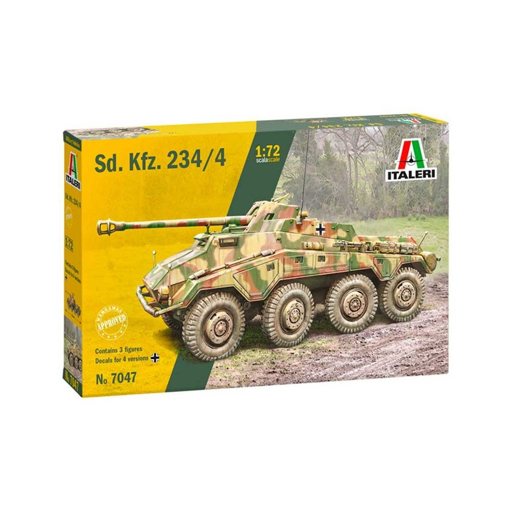 SUPER DECALS SHEET FOR 4 VERSIONS – COLORS INSTRUCTIONS SHEET – CONTAINS 3 FIGURESThe Schwerer Panzersphwagen Sd.Kfz. 234 armoured car series was produced by Germany during the final phases of the Second World War. The vehicles were characterized by a high standard of construction quality that offered mobility, protection, and offensive capability. The 234 could reach a maximum speed of 85 km / h on the road. Of the versions produced, the Sd.Kfz. 234/4 was armed with the powerful 75 mm gun KwK 40, capable of penetrating much of the armour of opposing enemy vehicles. The gun was installed in a fixed position in the centre of the open air combat chamber. The protection of the crew was afforded by a shield, like that of the Pak 40 used by the infantry. All these capabilities combined, provided the Wehrmacht with an armoured car that met the full range of operational requirements.