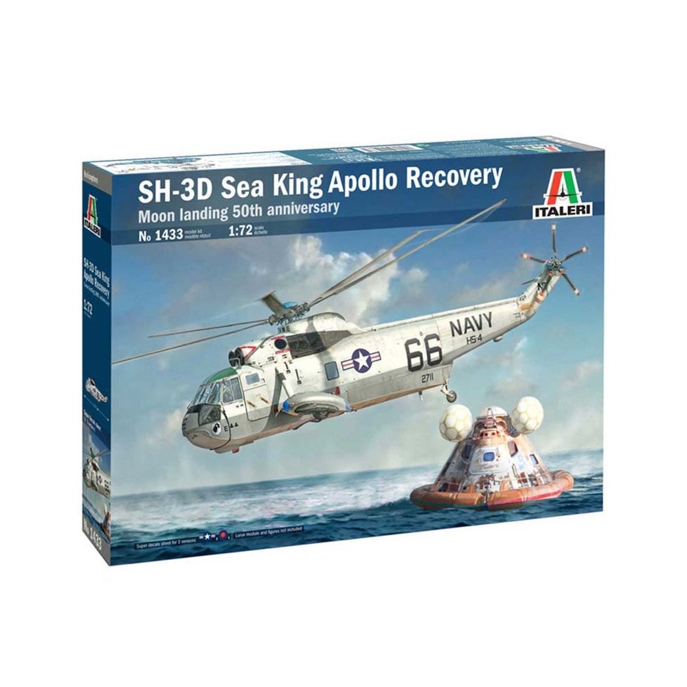 1/72 Sh-3D Sea King Apollo Recovery Italeri 1433SUPER DECALS FOR 3 VERSIONS – COLOR INSTRUCTIONS SHEETThe twin-engine helicopter SH-3 Sea King, developed and produced by the American company Sikorsky Aircraft, entered service in the 60s and it was widely used for years by the U.S. Navy to carry out numerous tasks and operational activities. Its main role of Anti-submariner warfare (ASW) helicopter was flanked by transportation and Search and Rescue (SAR) missions. Thanks to its design based on a sturdy structure, the folding main rotor blades and the tail section, the Sea King was the ideal solution to be used in naval-orientated operations and to be used on-board of the U.S. Navy ships. Furthermore the Sea King was the first helicopter to have amphibious capabilities. It could load a wide variety of armament as torpedoes, depth charges and anti-ship missiles. The SH-3 Sea King was also produced under license in Japan, in United Kingdom and in Italy. Among the most interesting version the Sea King S.A.R. that recovered the crew of the lunar mission Apollo in 1969.