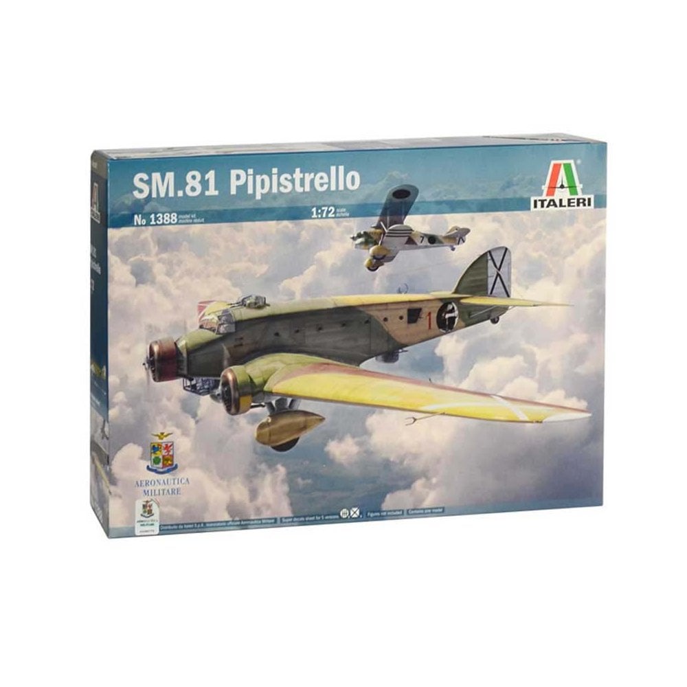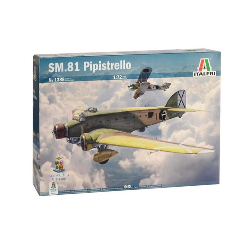 1/72 SM.81 Pipistrello Italeri 1388SUPER DECALS SHEET FOR 5 VERSIONS – COLOR INSTRUCTION SHEETThe Savoia Marchetti SM 81 began service in the bombing units of the Regia Aeronautica (Italian Royal Air Force) around the middle of the 1930s. It operated in the campaign in Ethiopia, in the Spanish Civil War and during World War II. It had three engines with low wings and a fixed undercarriage. It was propelled by 3 Alfa Romeo 125 RC 35 engines with 650 Hp each, or, successively, by more powerful Piaggio P. X RC.35 700 Hp engines which brought it to a maximum speed of 340 Km/h. Armed with 6 7.7 mm Breda-Safat machine guns, it had an offensive payload of 2,000 kg in bombs. At the time of its entrance in service, it was one of the most modern bombers in the world, but at the start of World War II, by then surpassed, it was predominantly used for night time missions. For this reason it was nicknamed bat. Nevertheless over 300 SM 81s equipped the Regia Aeronautica squadrons on various fronts, from the Aegean Sea to North Africa.