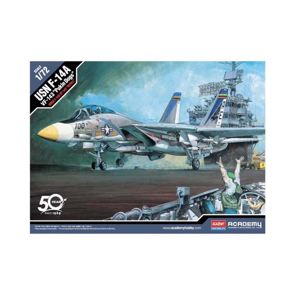 The Academy 1/72 scale Grumman F-14A Tomcat kit offers an excellent replica of one of the US Navy’s most iconic fighters. This edition includes markings for VF-143 “Pukin’ Dogs,” a squadron known for its long service aboard aircraft carriers.
