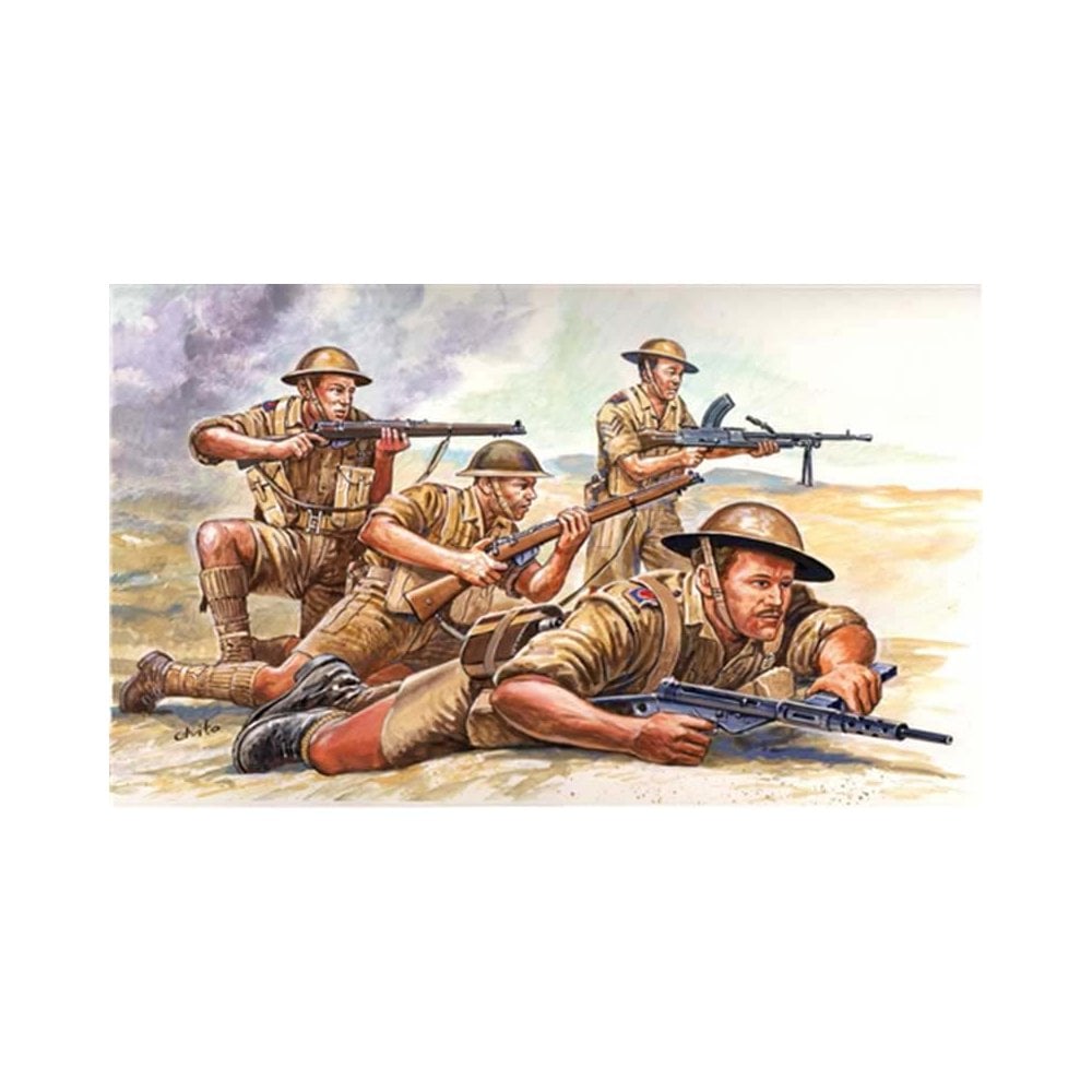 1/72 WWII British 8th Army Italeri 6077In August 1942, after the British army was defeated in Northern Africa by the troops of the German-Italian Axis, Winston Churchill replaced General Auchinleck with General Montgomery. General Bernard Law Montgomery soon counterattacked with the 8th army. He was the strategist of the battle of El-Alamein in Egypt, that ended with the defeat of the German-Italian forces led by General Erwin Rommel. The soldiers in this kit are represented with the traditional tropical uniform and are equipped with Lee Enfield rifles, Sten submachine guns and Bren machine guns.