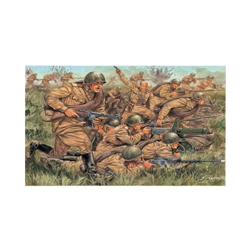 During World War II, the Red Army counted more than 11 millions of men including troopers, NCOs and officers. The huge mobilization ordered by Stalin as a reaction to the German invasion in June 1941 (Operation Barbarossa) made of the Red Army the largest army in history. The models in this kit are represented with the characteristic individual equipment of the Soviet trooper: the already obsolete Mosin-Nagant rifles, the Svt-40 semiautomatic rifles, and the P.P.Sh submachineguns with drum magazine.