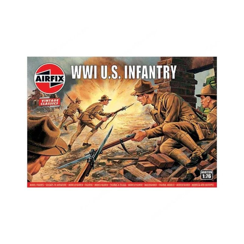 1/76 WWI U.S. Infantry Airfix Vintage Classics A00729VMould Tools made in 1967, pack Illustration by Brian Knight, 1969. Enjoy the nostalgia with Airfix Vintage Classics.These are the Doughboys that arrived in France and took part in the last great battles of the First World War. Their equipment includes light machine guns and a remote-controlled rifle.Contains 48 unpainted pieces.