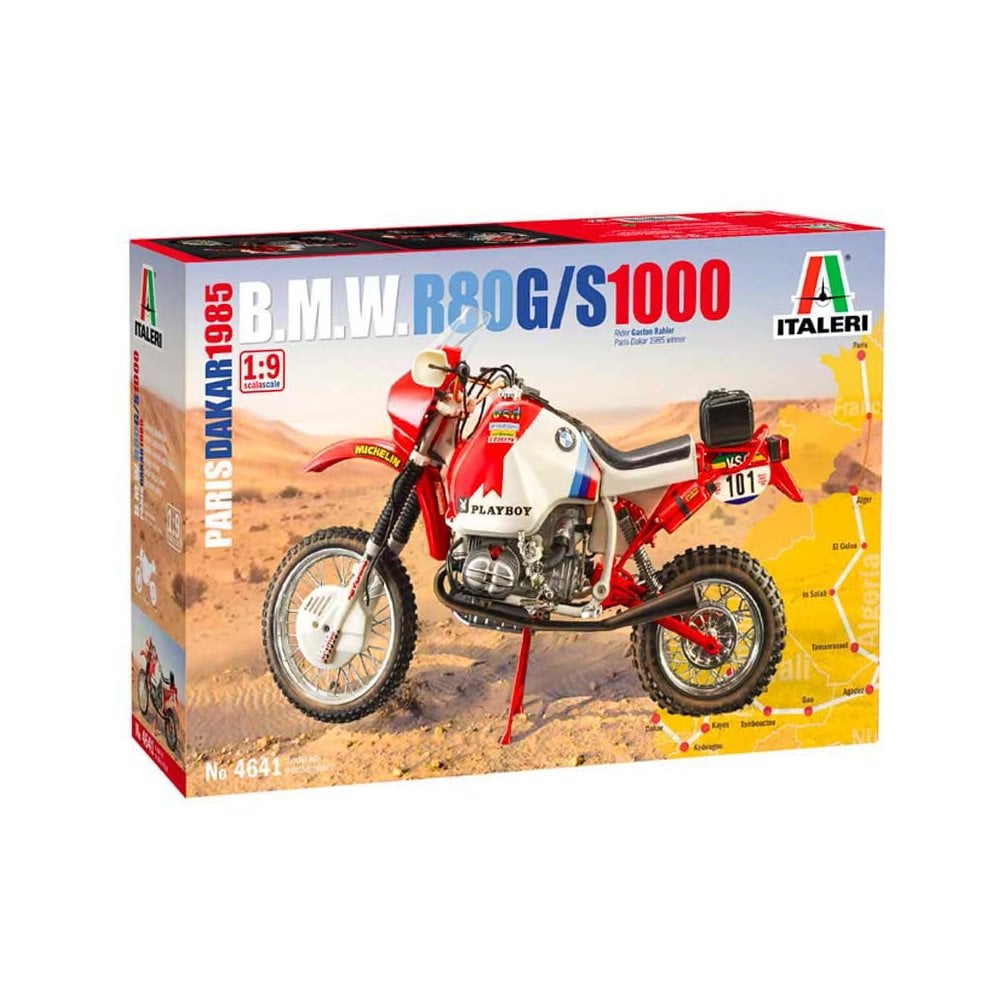 1/9 B.M.W. R80 G/S 1000 Paris Dakar 1985 Italeri 4641COLOR INSTRUCTION SHEET – RUBBER AND CHROMED PARTS – SCREWS, SPRINGS AND RUBBER TUBESDuring the 1980s Paris-Dakar was one of the most important events for all fans of two and four wheels. In the mid-80s the German manufacturer BMW created a special series of the famous R80 GS motorcycle dedicated to this prestigious off-road competition. Beginning with the chassis of the standard version which was much appreciated by customers for its solidity, robustness and reliability, the Munich based manufacturer made several more modifications and improvements. In addition to the technical innovations that increased the off-road and endurance capabilities such as the tires, reinforcement bars and the specific rider protection features, the most significant element was the large 32-liter oversized tank specifically developed for the special version. Great attention was also given to the bike graphics with the application of the famous BMW Motorsport three colours of blue, purple and red livery. The bike was produced in limited numbers from 1984 to 1987 and is still highly appreciated by collectors and two-wheel fans.