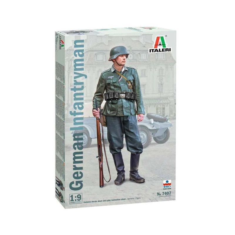 1/9 German Infantryman Italeri 7407SUPER DECALS SHEET – COLOR INSTRUCTIONS SHEETThe Wehrmacht, was the name the German army was commonly known as during the war on all European and North African fronts for almost 6 years from 1939 to 1945. On September 1 1939 two Wehrmacht army groups invaded Poland thus starting World War II. The Wehrmacht was characterized as an efficient military and logistics organization achieving impressive military successes on the battlefield and for its use of the term Blitzkrieg to describe the strong and effective co-ordination of armored troops, motorized infantry and close air support. The German infantryman in the early stages of the conflict wore the typical feldgrau uniform and was issued with the Mauser K-98 rifle, the MP40 submachine gun and the well-known Stielhandgranate hand grenade.