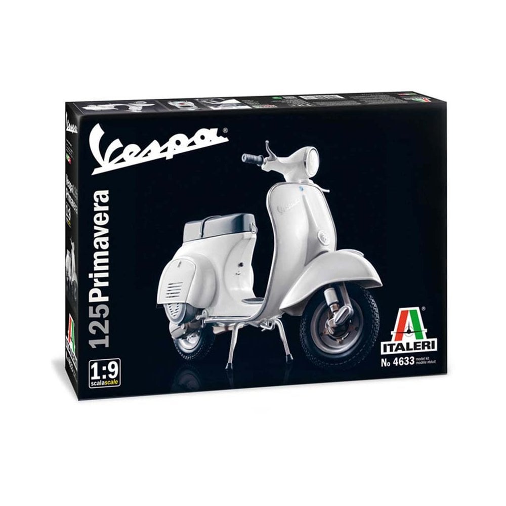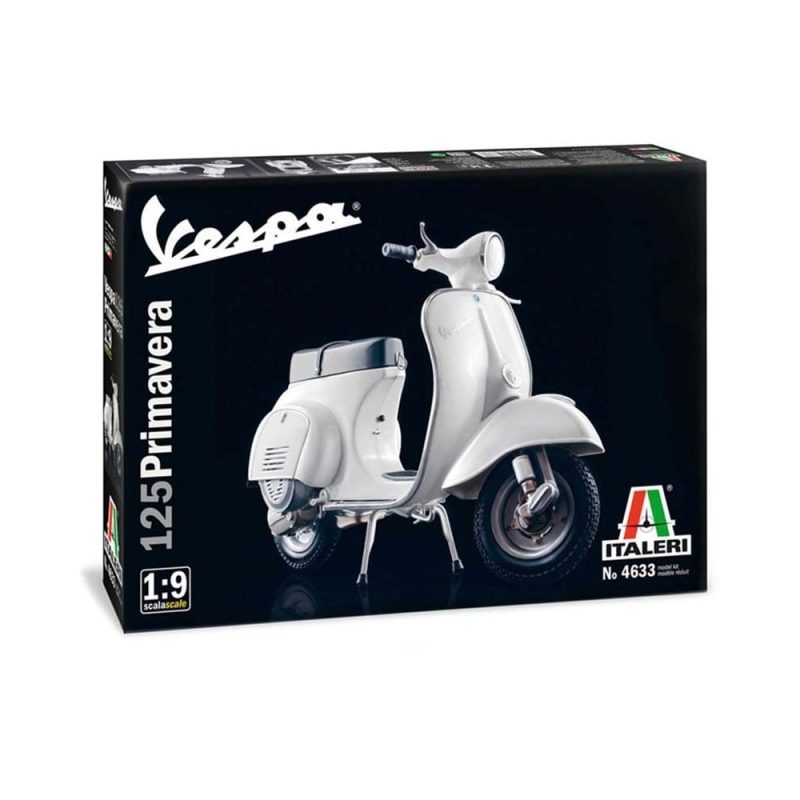 1/9 Vespa 125 Primavera Italeri 4633Chromed parts – Color Instuctions sheetVespa is an icon of design and style of the “made in Italy” and a real myth on two wheels. The first Vespa was born in the second post-war period, in 1946, and was immediately characterized by simple and elegant lines, and by a practical, functional and reliable project developed around the famous steel body-frame. The effective mix of design and functionality was the strength of the Vespa, that became, in a short time, an extraordinary commercial success worldwide. During the years Vespa was able to keep its uniqueness but improved in style and features. One of the most famous version was the Vespa Primavera 125 launched in 1968. Thanks to an improved engine, a better performance and a easiness of driving, it remained on the market throughout the 1970s. The Primavera 125 is still today one of the most preferred Vespa by collectors and fans of the famous Italian two-wheeler manufacturer.