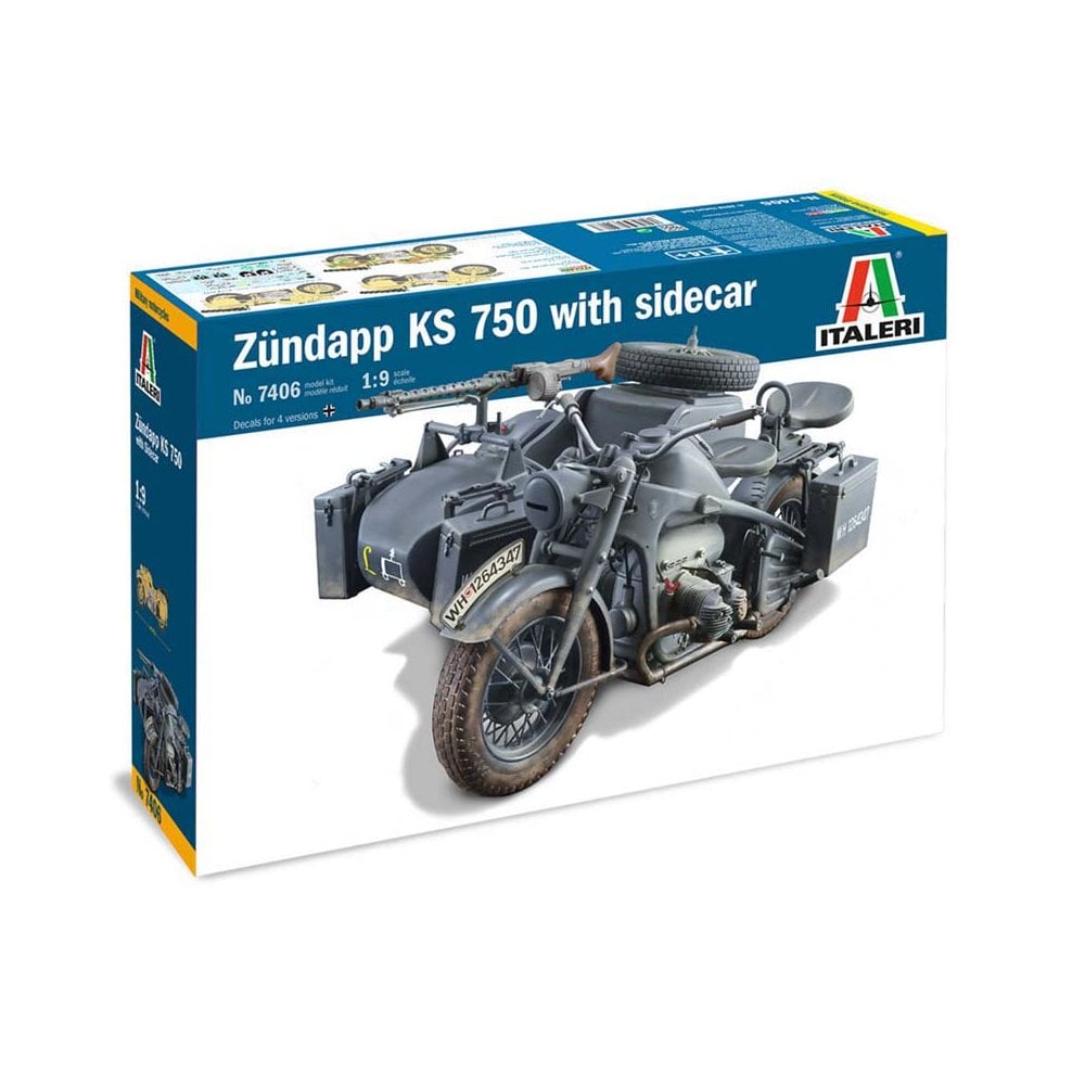 1/9 Zundapp Ks 750 With Sidecar Italeri 7406SUPER DECALS FOR 3 VERSIONS – COLOR INSTRUCTIONS SHEETThe motorcycle and sidecar Zundapp KS 750 was widely used during the Second World War by the German army on numerous battlefronts. The development, based on a specific OKH need, was set up in 1937 and rnade by Zundapp and BMW. Thanks to the 751 cc boxer twin-cylinder engine capable of delivering 26 HP, the KS 750 could reach the top speed of 95 km/h. For the gearbox was adopted a four speed lay-out with the reverse gear. Together with the BMW R75, with which the KS750 shared many technical components to improve the easiness of maintenance and availability of spare parts, it was used to perform a wide variety of duties from transport to reconnaissance. For several duties it was substituted very soon by the Kubelwagen, more practical and easy to produce and maintain. It could be armed with a MG34 machine gun installed in the sidecar’s boot.