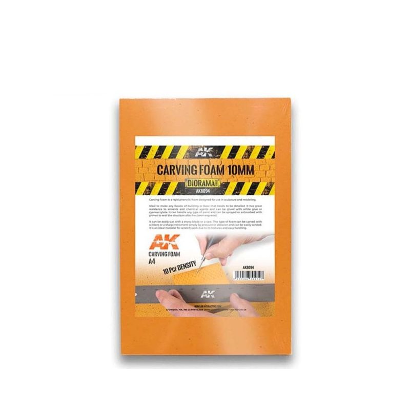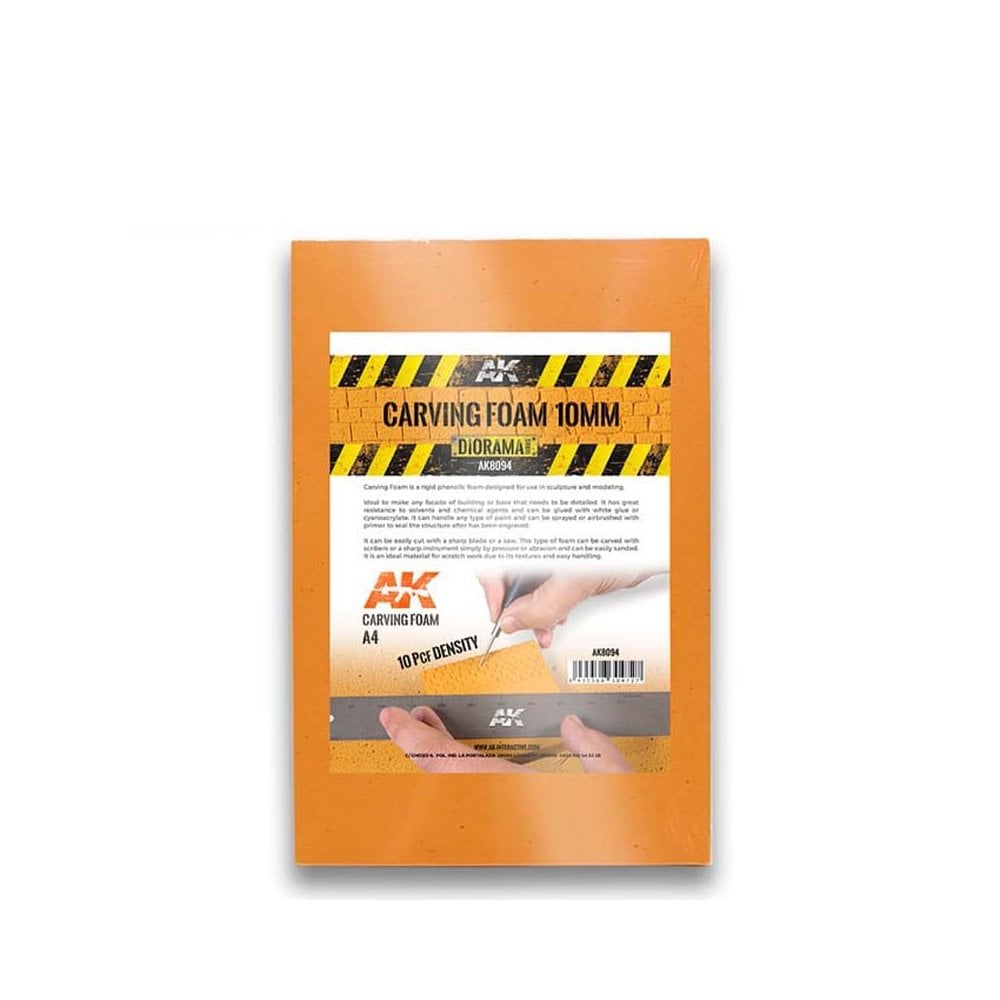 10mm A4 Carving Foam AK Interactive AK-8094Our foam range brings you the materials that are indispensable for building various parts of yourdioramas and vignettes, in different sizes and densities that are most useful for scale modeling,at competitive prices. Theres no need to look for building materials in any weird places – we haveselected the best materials for modeling purposes specially for you.CARVING FOAMThis product is a phenolic foam that can be used for creating various structures such as buildings, walls, pavements etc. In comparison with our ConstructionFoam, the Carving Foam is more rigid and resist