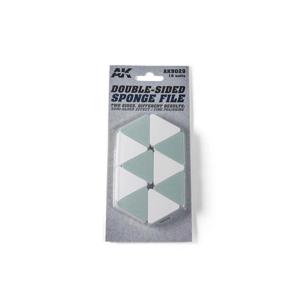 10x Double-Sided Sponge File AK Interactive AK9029Practical sanding sponges, triangular finishing, to reach the most difficult corners. Its two faces have a different grain for the most demanding finishes. Semi-gloss and polished effect.